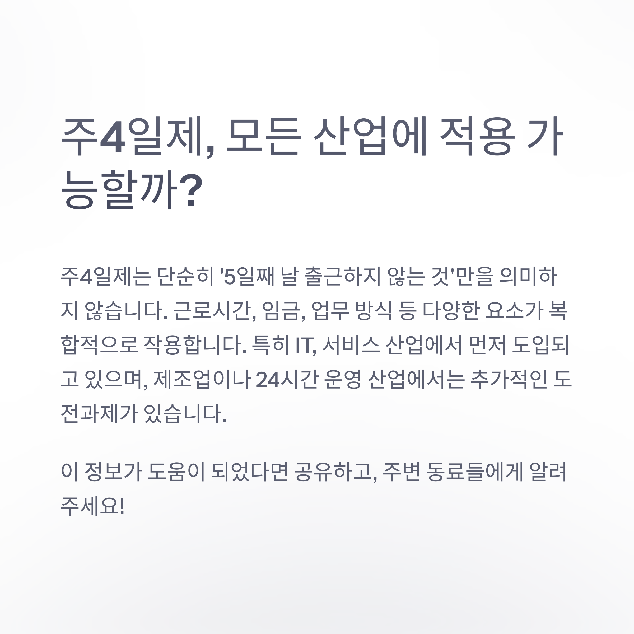 이는 모든 산업과 직종에 주4일제가 동등하게 적용될 수 없음을 의미합니다. 특히 제조업, 운수업 등 24시간 운영이 필요한 산업에서는 주4일제 도입에 추가적인 도전과제가 있을 수 있습니다.