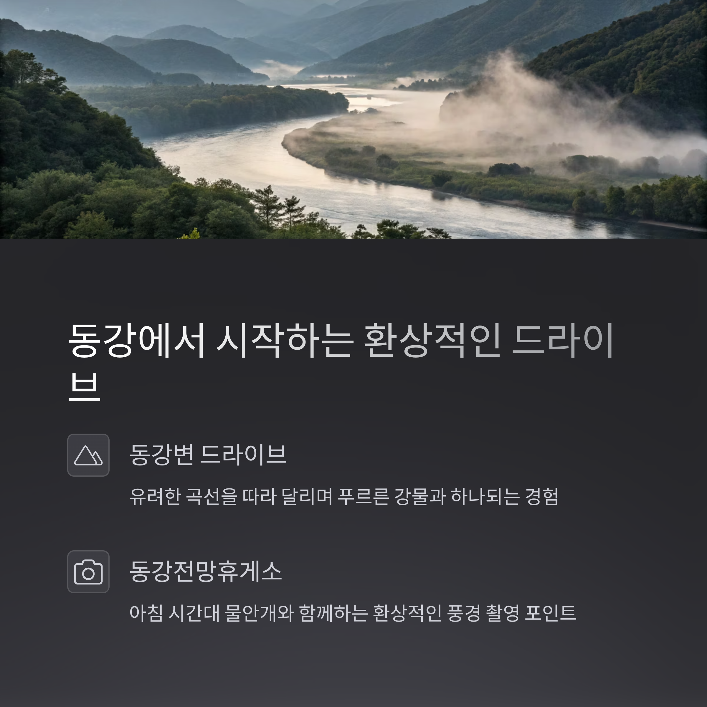 "복잡한 도심을 벗어나, 영월의 여백 가득한 도로 위에서