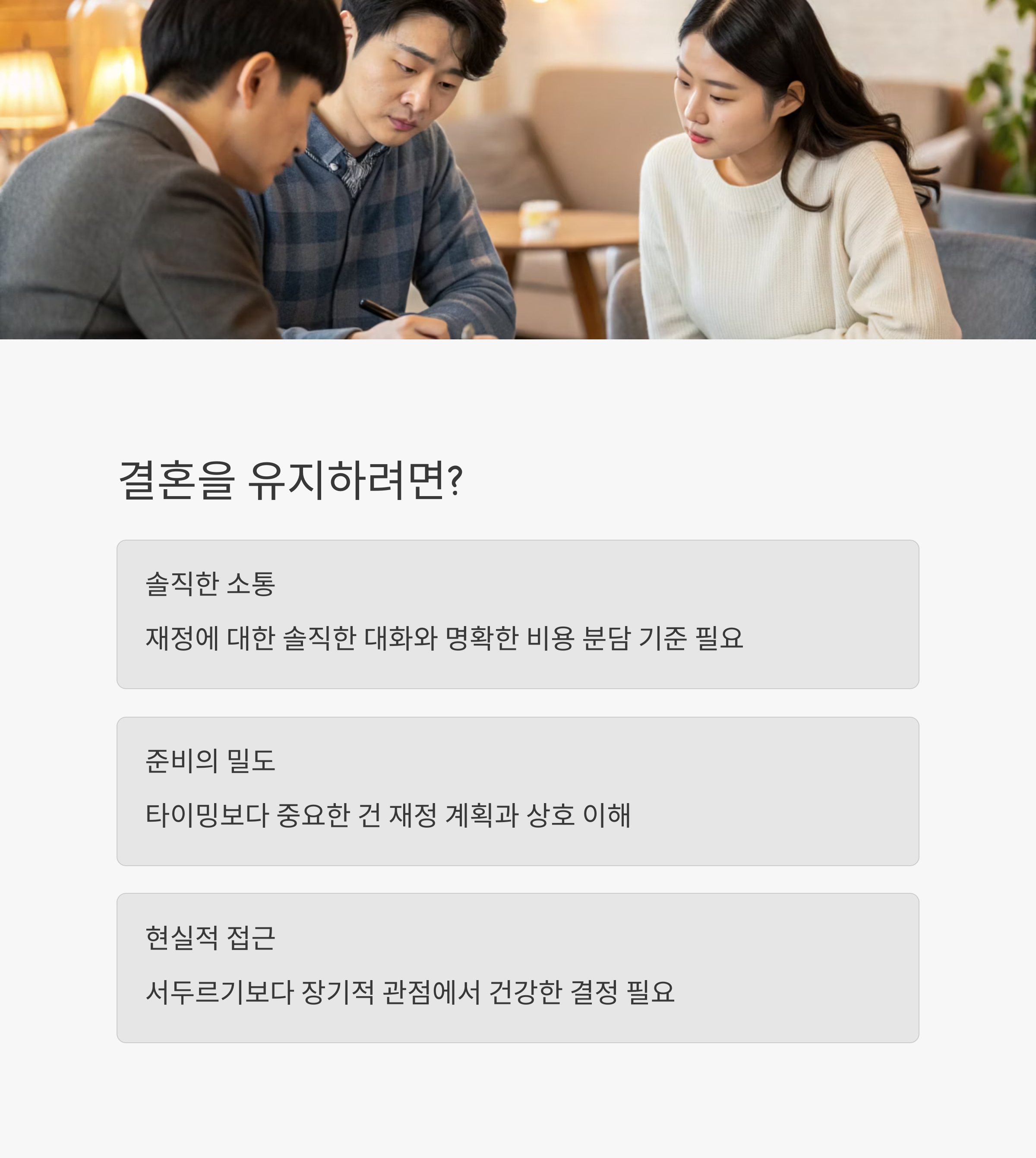 → 예비 부부 간 재정에 대한 솔직한 소통, 역할과 비용 분담의 명확한 기준이 선행되었다면