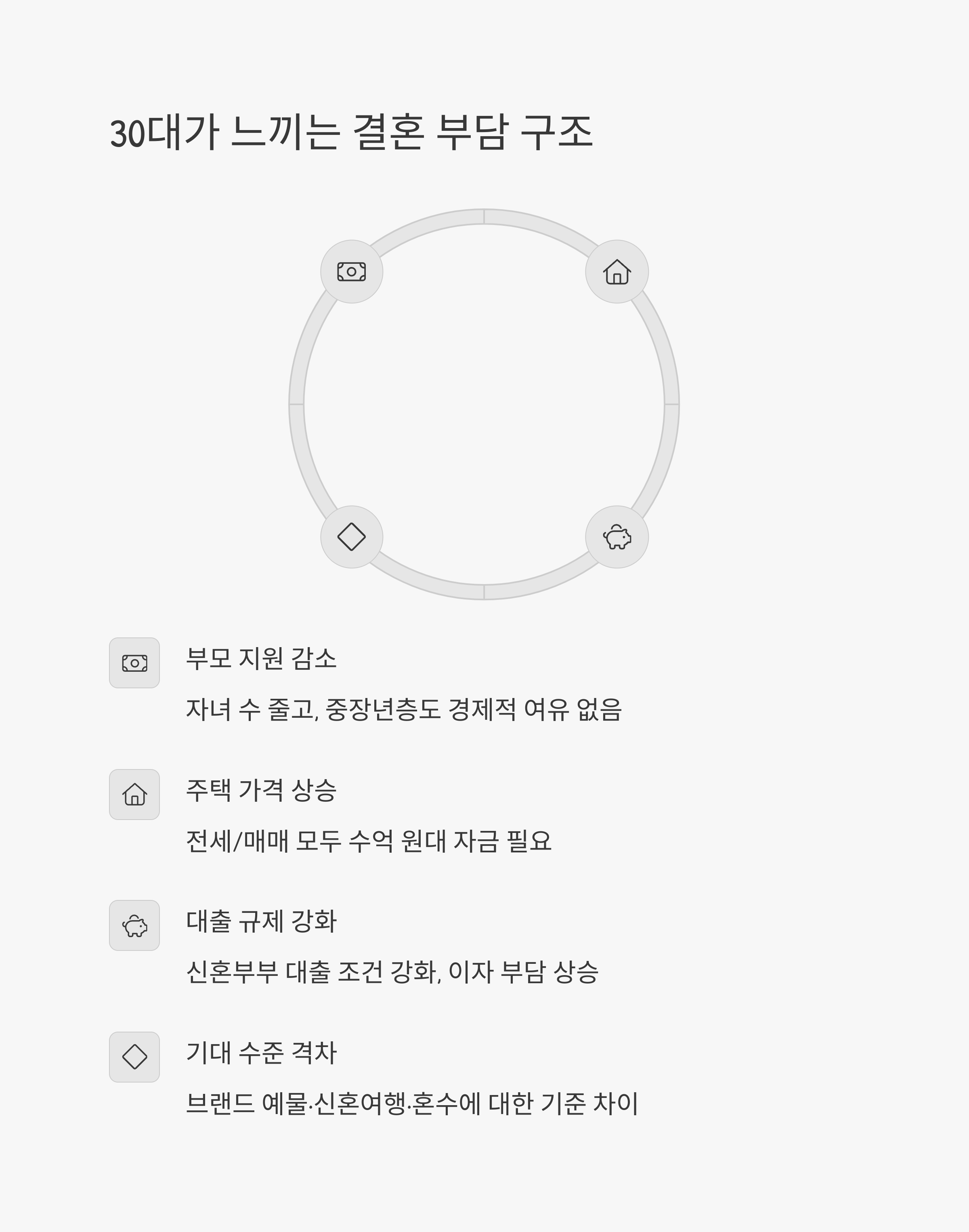 | 기대 수준 격차 | 브랜드 예물·신혼여행·혼수에 대한 기준 차이 |