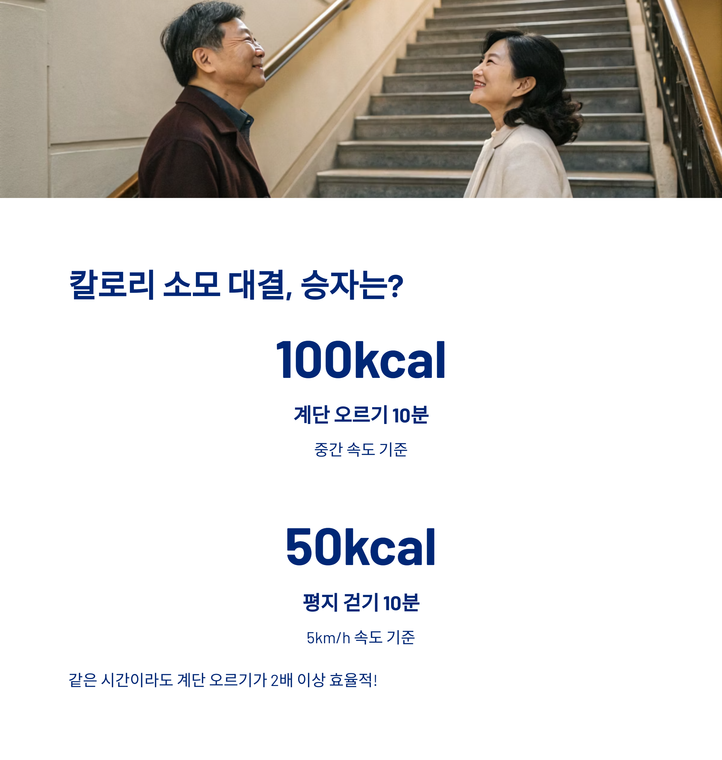 계단 오르기는 짧은 시간에 많은 칼로리를 소모하지만, 걷기는 장시간 누적 소모가 강점입니다