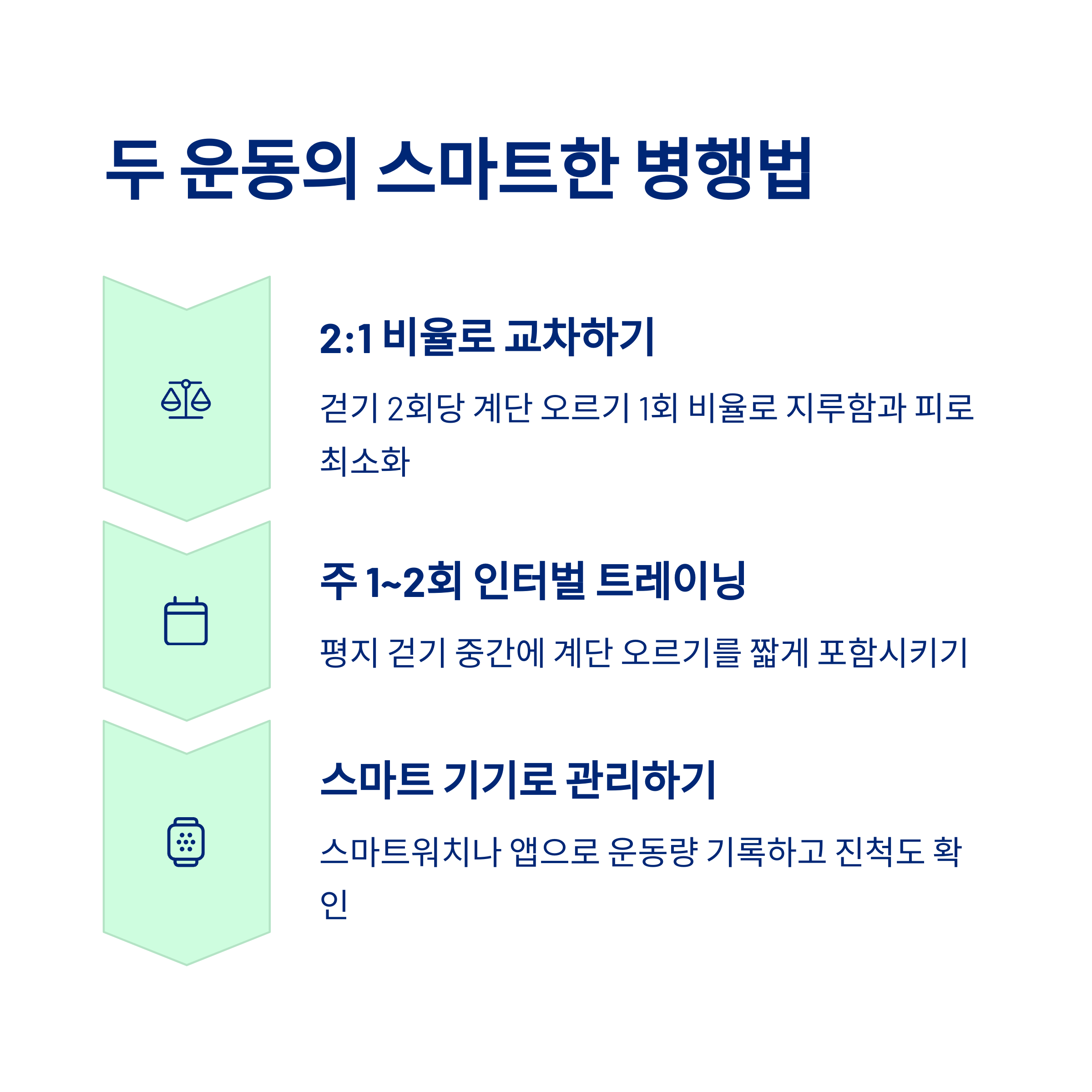 주 2회 계단 오르기 + 주 3~4회 평지 걷기를 조합하면 효과적입니다