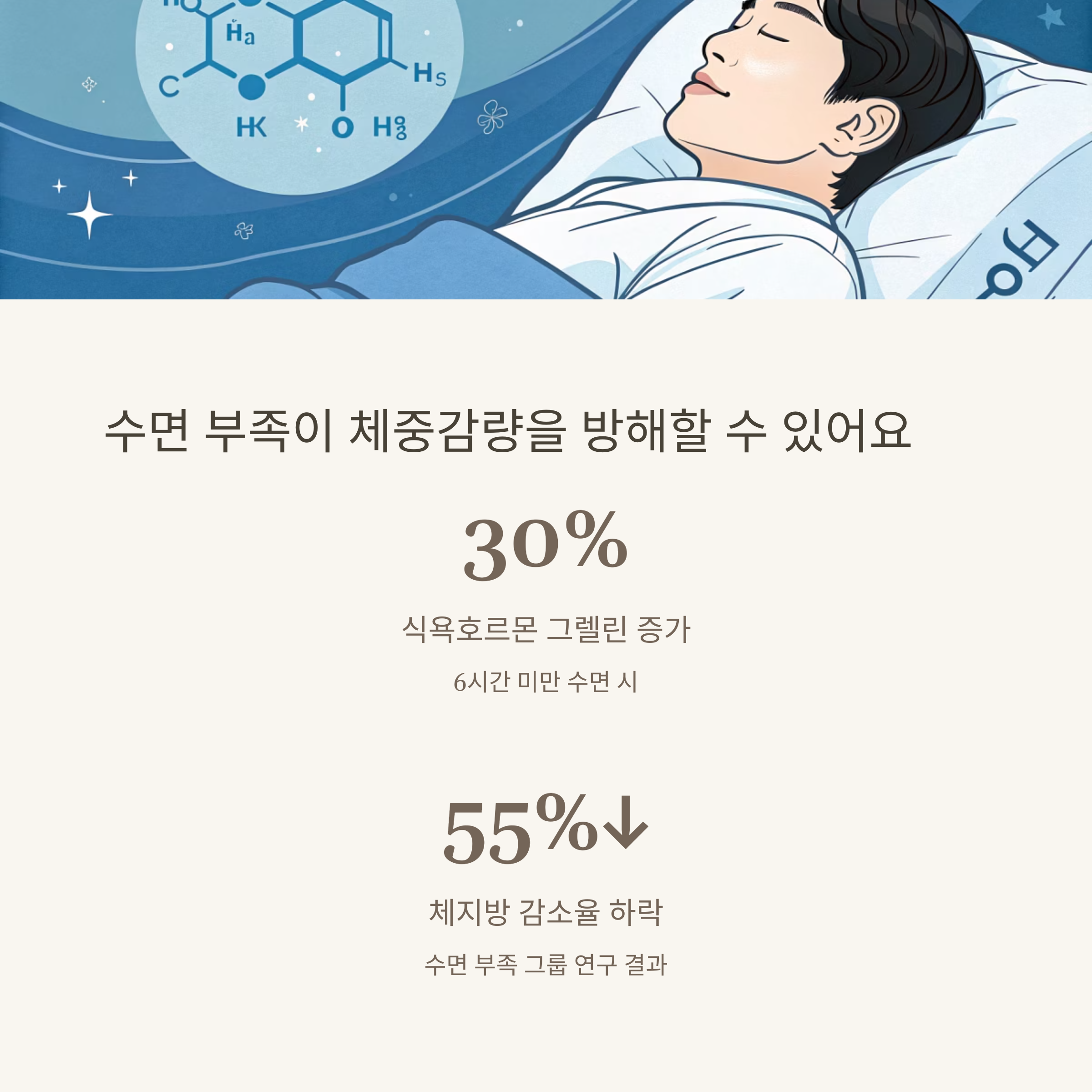 | 탄수화물과 단백질 비율이 불균형하면 감량 어려움 | 수면 부족은 폭식, 피로, 대사 저하 유발 | 유산소만 고집하면 기초대사량이 낮아질 수 있음 |