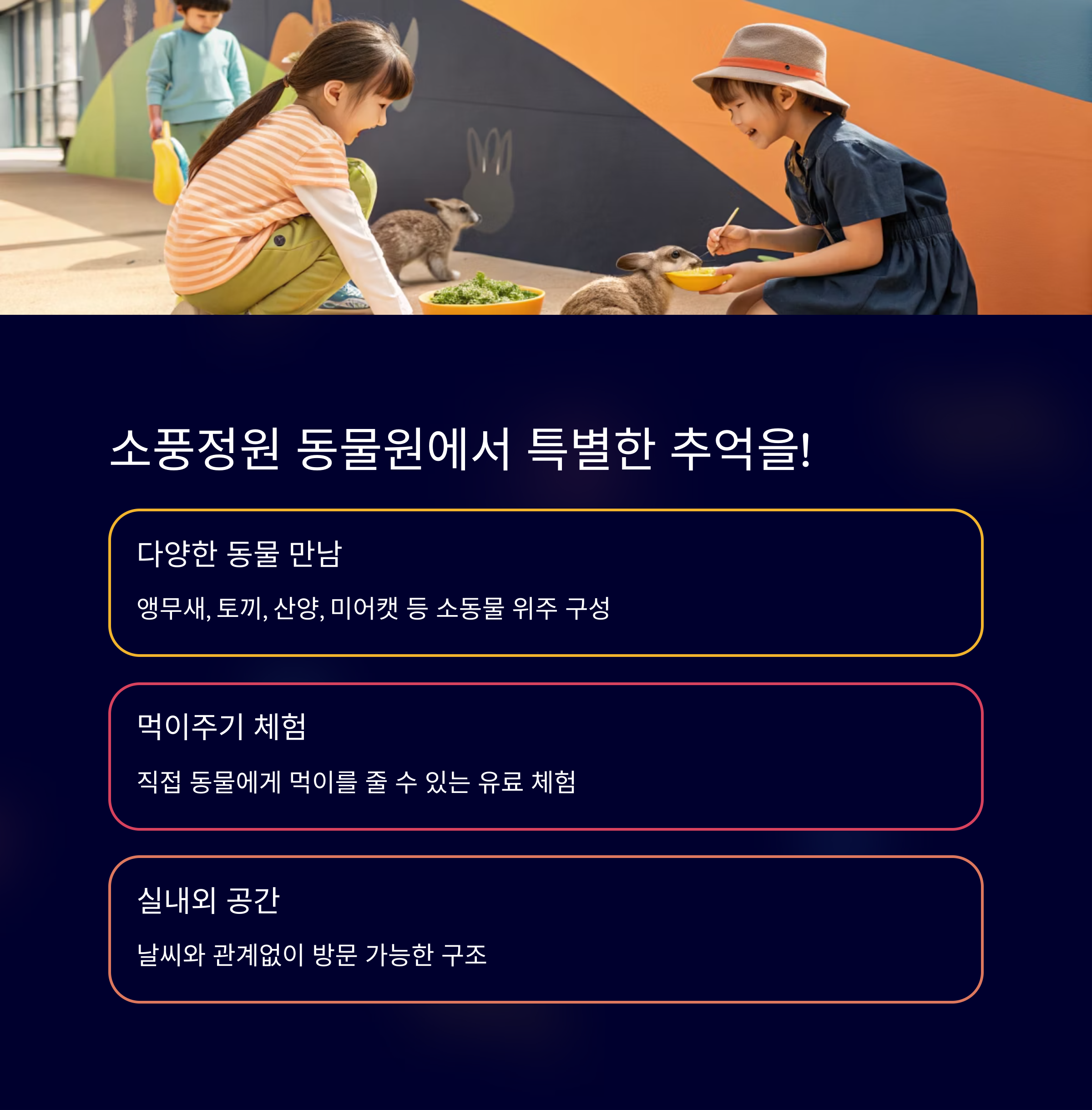 - 앵무새, 토끼, 산양, 미어캣 등 소동물 위주 구성