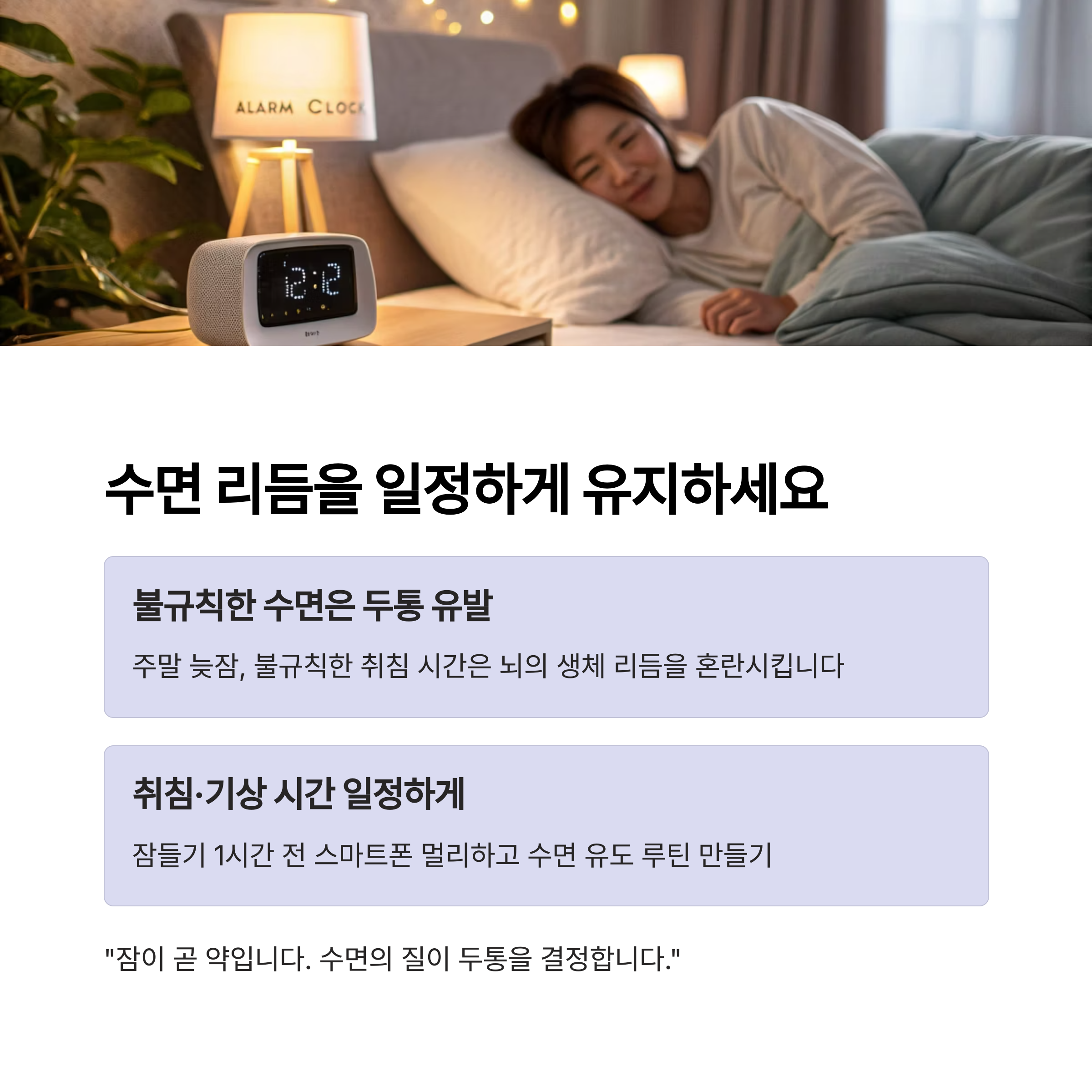"잠이 곧 약입니다. 수면의 질이 두통을 결정합니다."