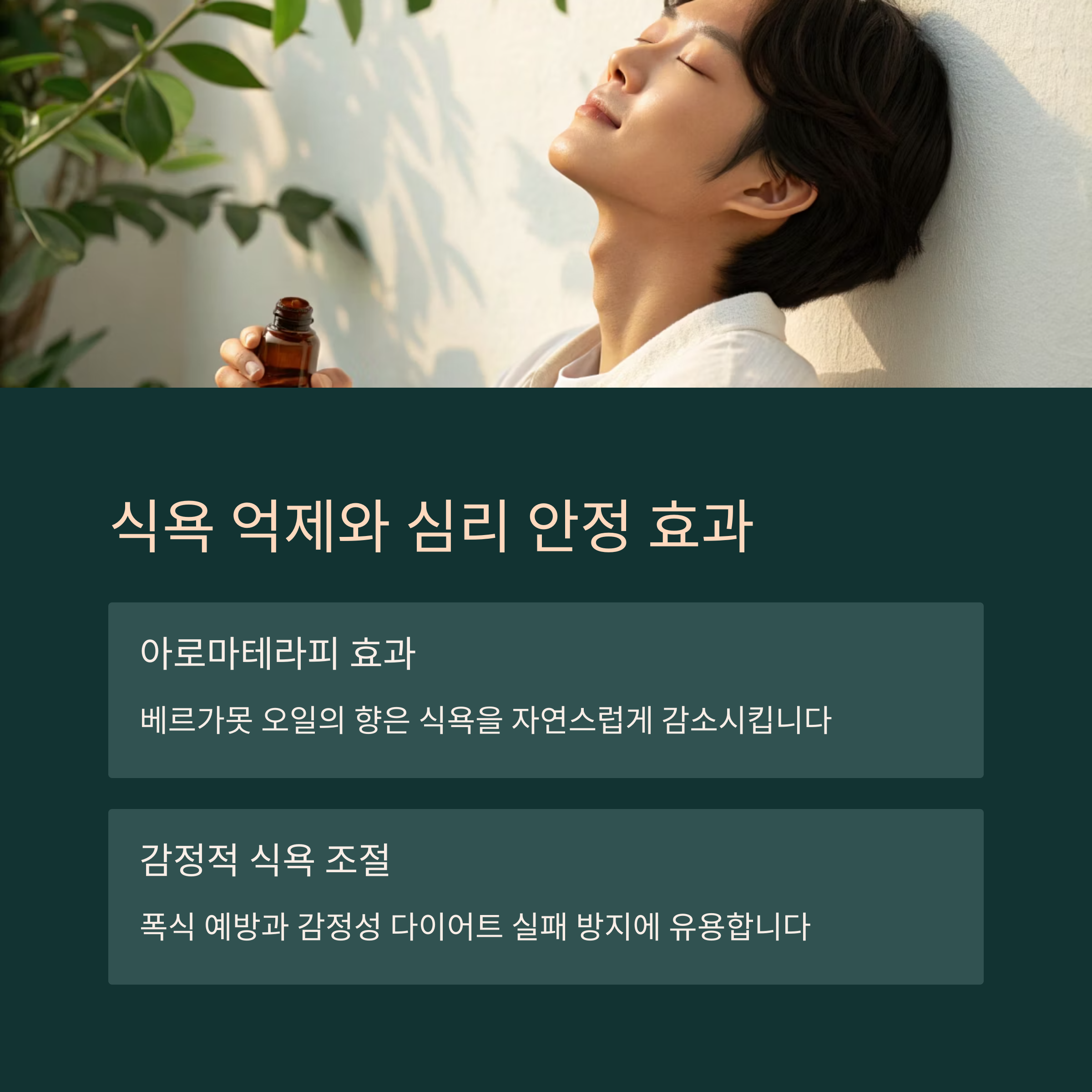 베르가못 오일의 향은 식욕을 자연스럽게 감소시키는 아로마테라피 효과를 가지고 있습니다.