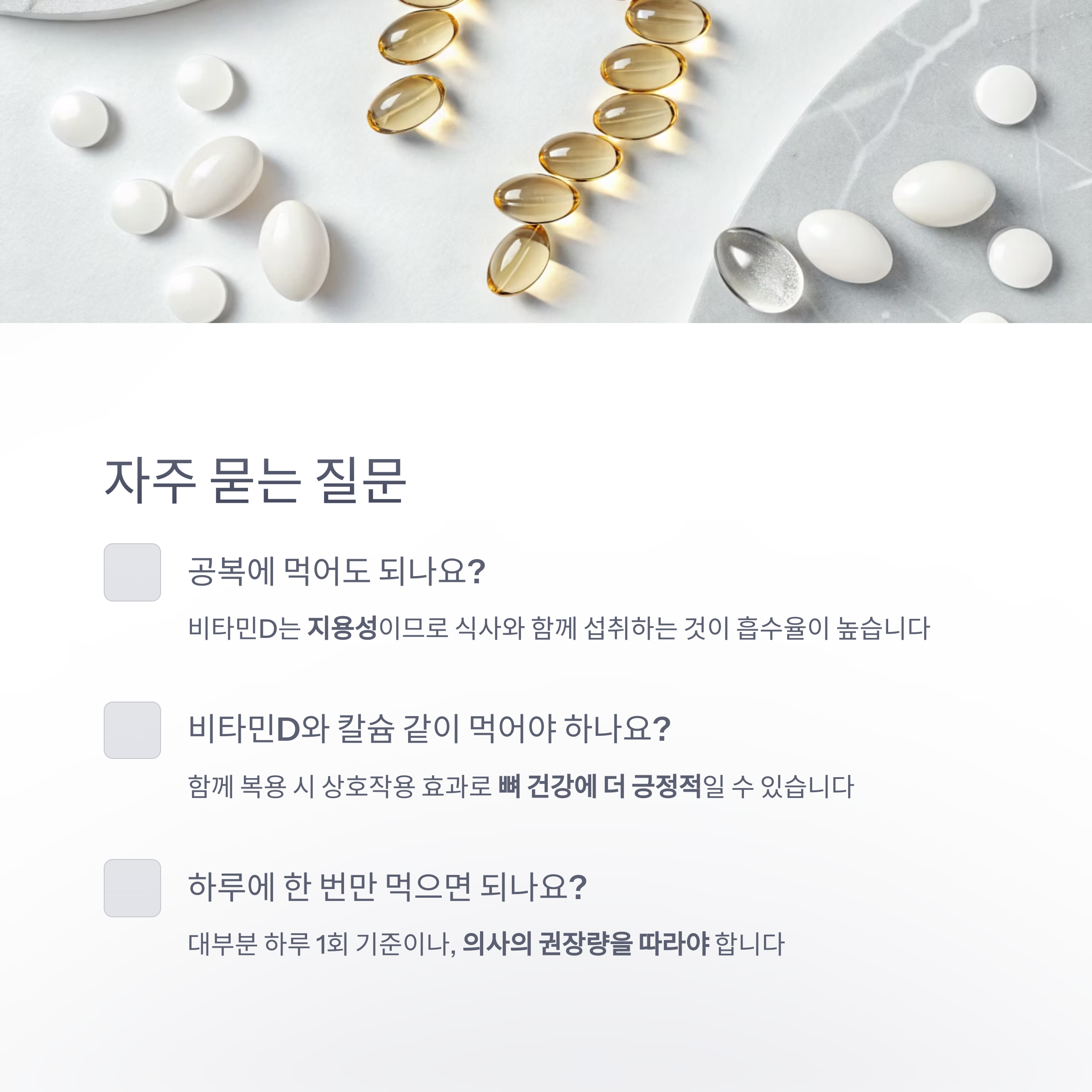 → 대부분의 비타민D 보충제는 하루 1회 기준입니다.