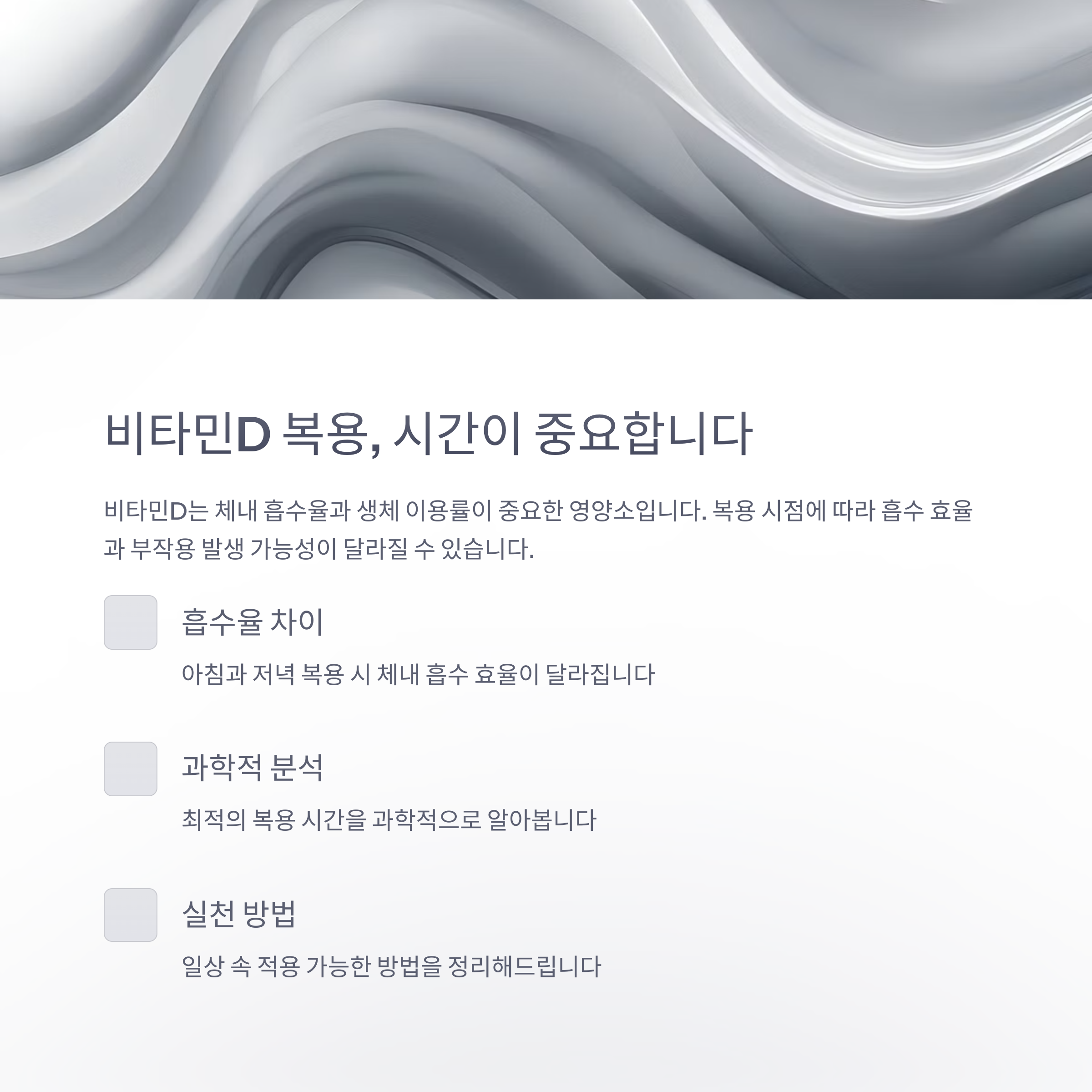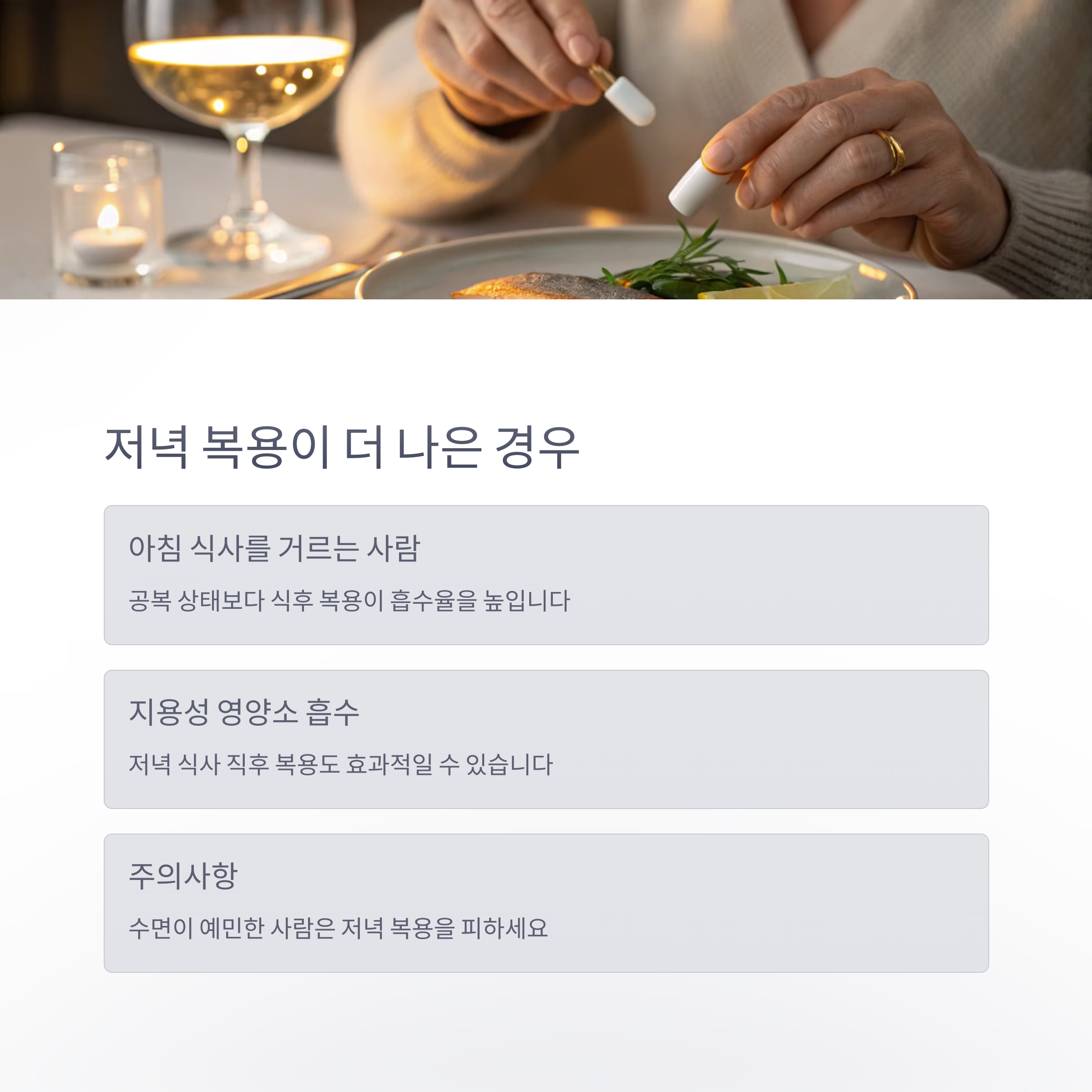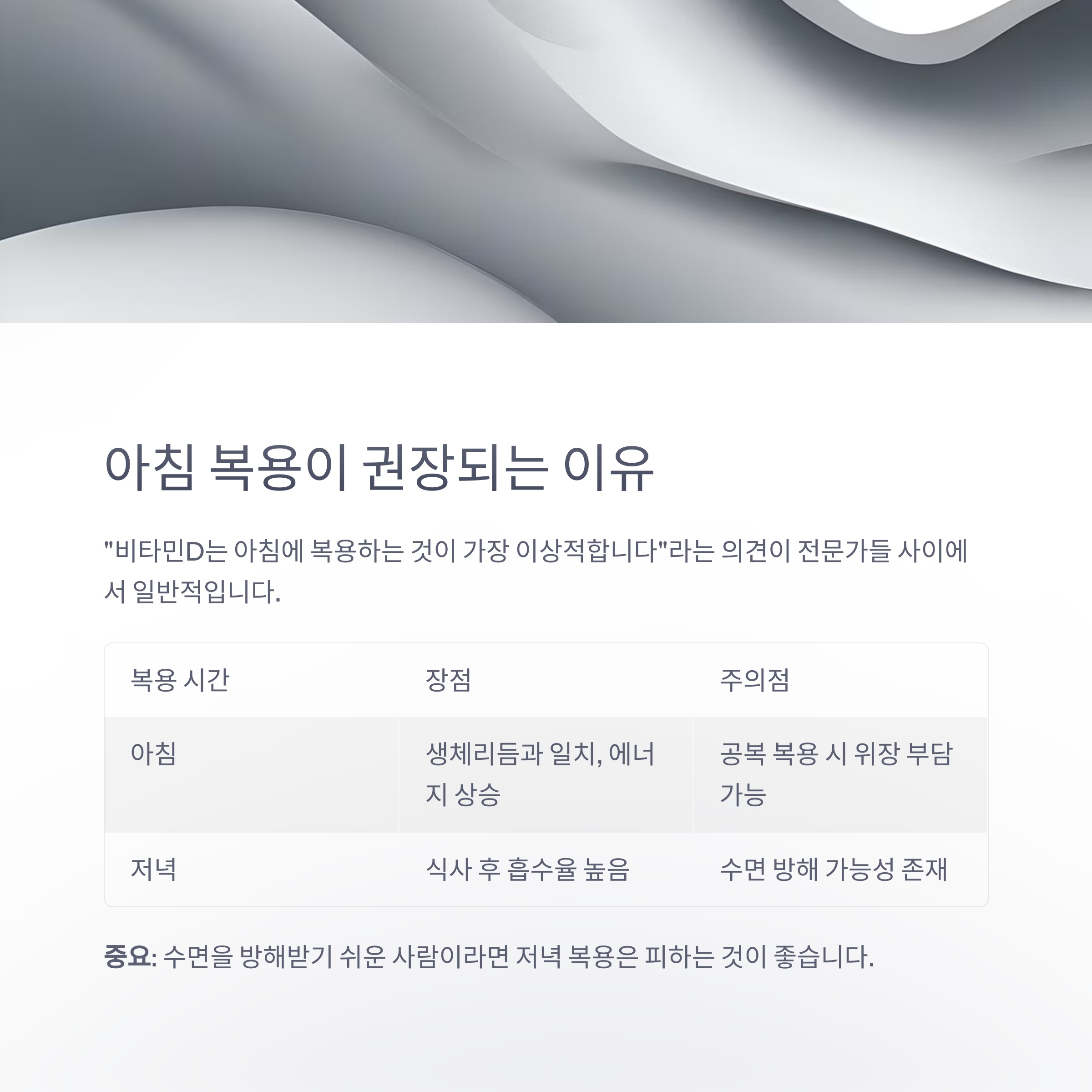 이런 경우, 비타민D는 저녁 식사 후 복용이 현실적으로 더 적합할 수 있습니다.
