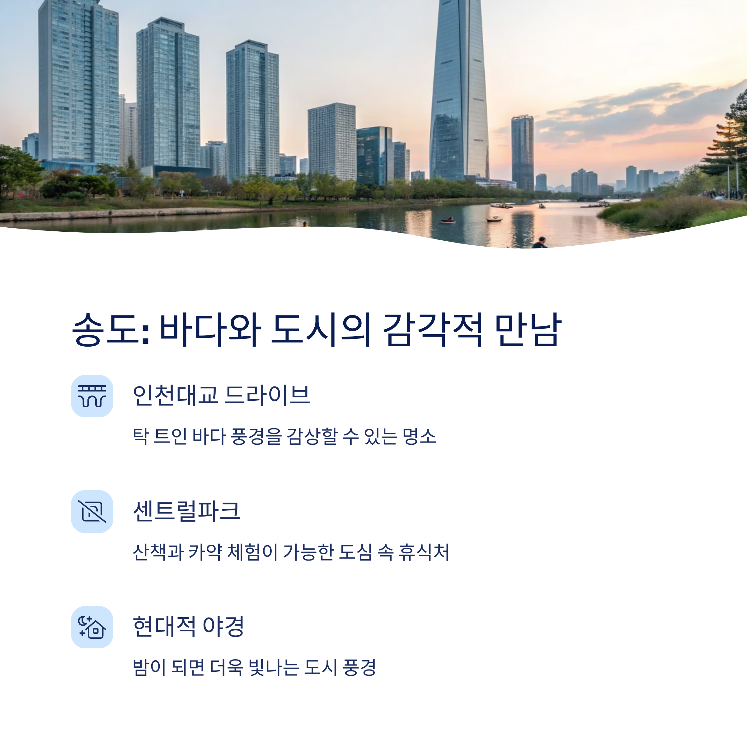 "시간은 짧지만 분위기 있는 하루를 원할 때, 송도는 탁월한 선택입니다."