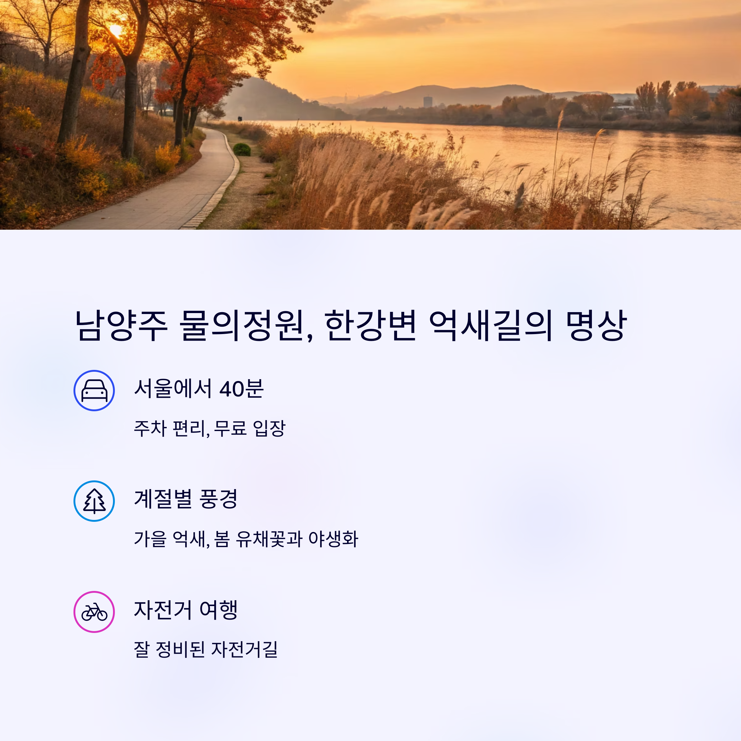 "걷기 좋은 억새길과 탁 트인 한강 전망이 어우러진 최고의 힐링 스팟"입니다.
