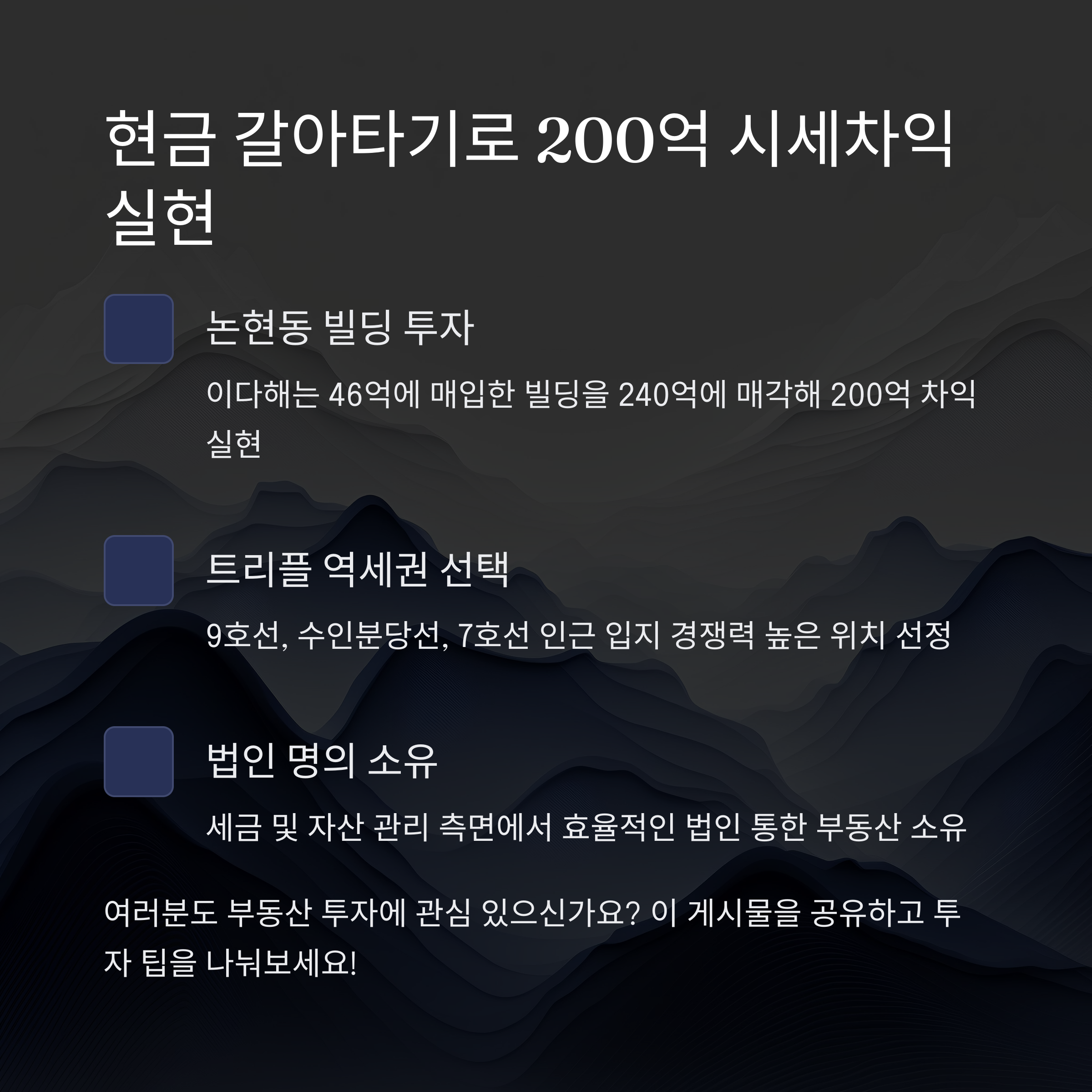 이 빌딩을 매입하기 직전, 이다해는 인근에 보유하고 있던 다른 건물을 매각하여 약 200억 원의 시세차익을 남겼습니다. 이 매각한 건물은 논현동 학동로44길과 언주로130길이 만나는 코너에 위치한 것으로, 2016년 4월 46억 800만 원에 매입했으며 2023년 8월에 240억 원에 매각하여 6년 만에 200억 원에 가까운 차익을 실현했습니다. 이렇게 확보한 자금으로 대출 없이 새로운 빌딩을 매입하는 '현금 갈아타기'에 성공했습니다7.