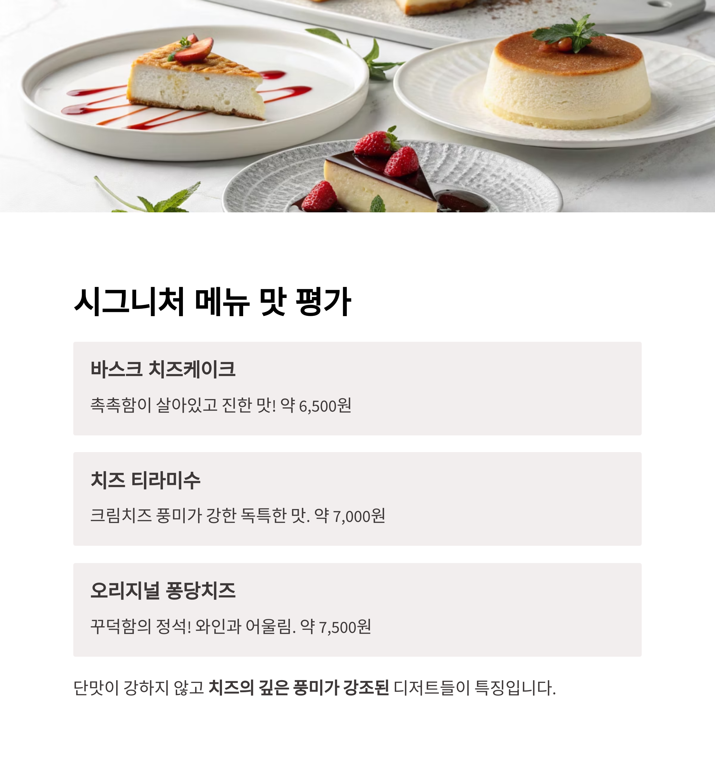 • 단맛이 강하지 않고 치즈의 깊은 풍미가 강조됨