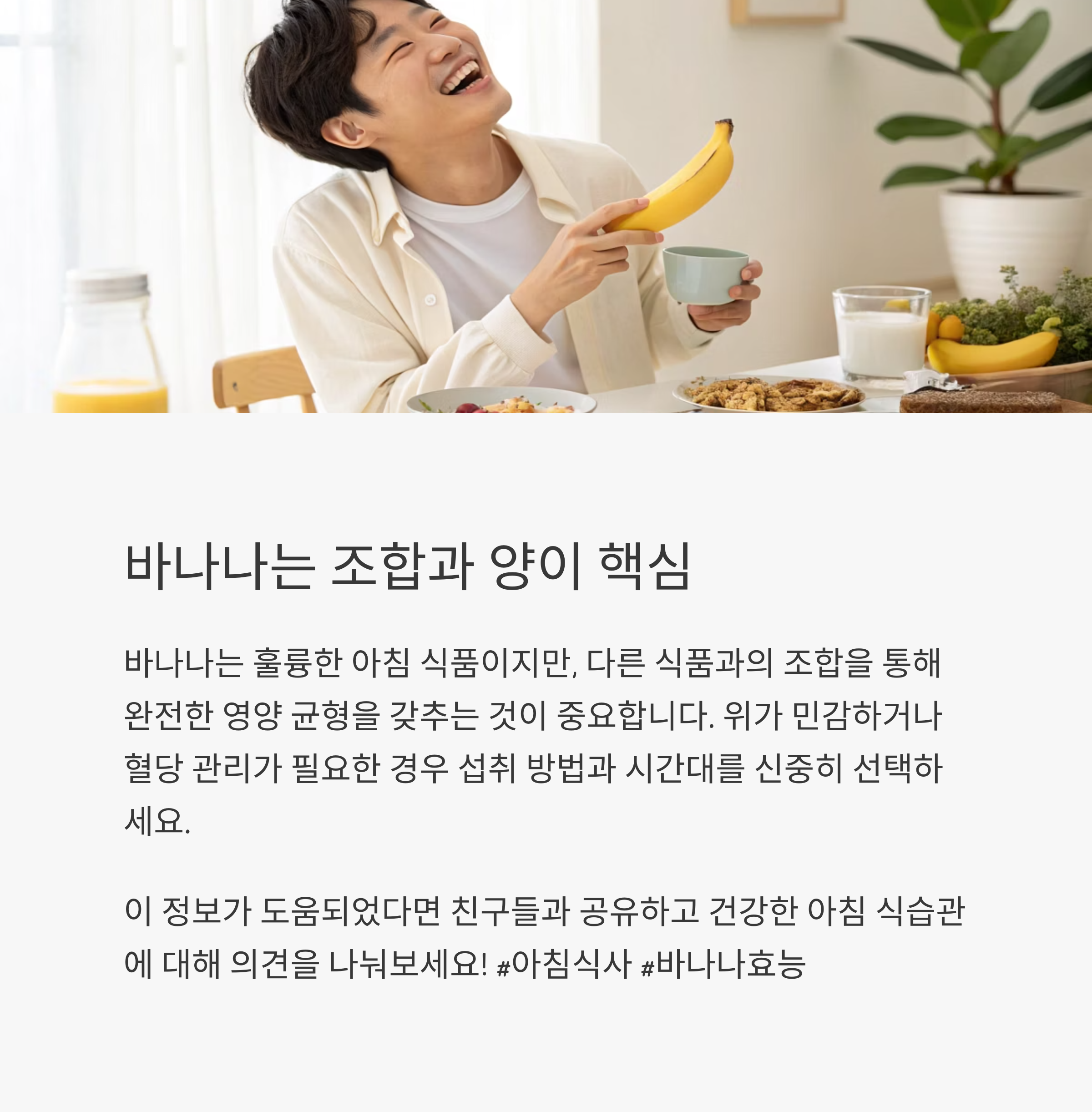 바나나 하나면 아침 식사 끝이라고 생각하기 쉽지만, 영양학적으로는 단백질과 지방이 부족하기 때문에 단독 식사로는 한계가 있습니다.