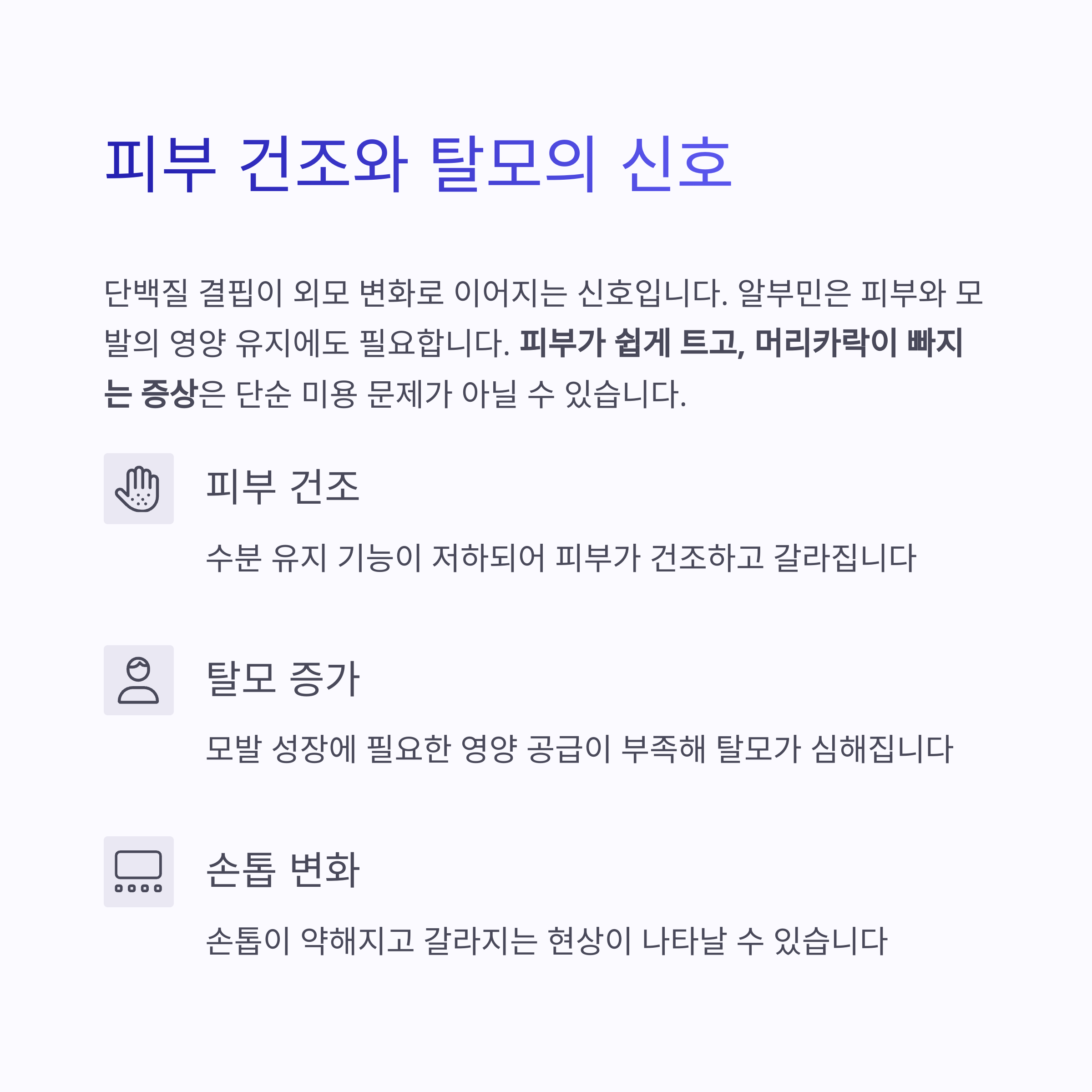 알부민은 피부와 모발의 영양 유지에도 필요합니다.