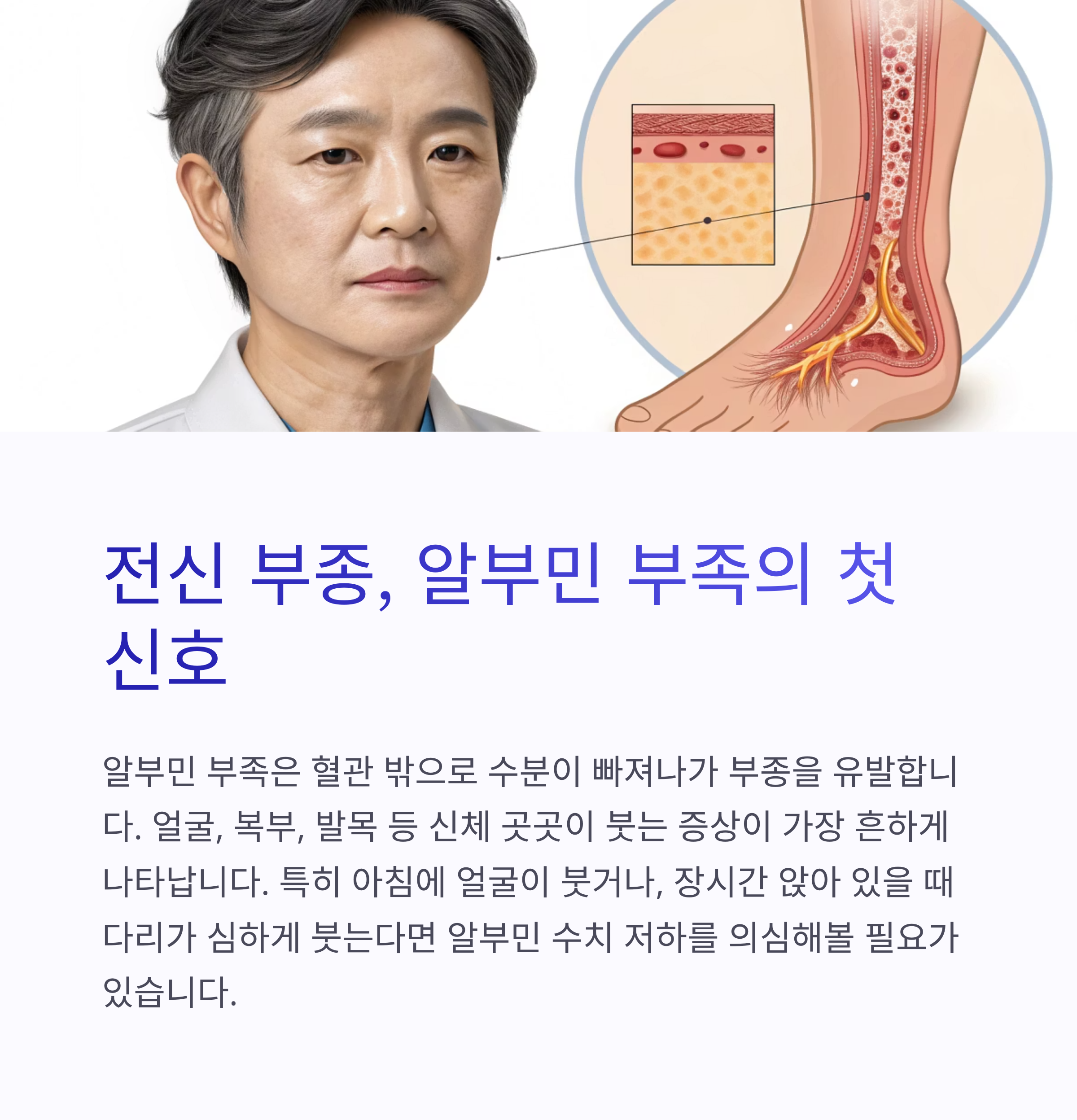 알부민 부족은 혈관 밖으로 수분이 빠져나가 부종을 유발합니다