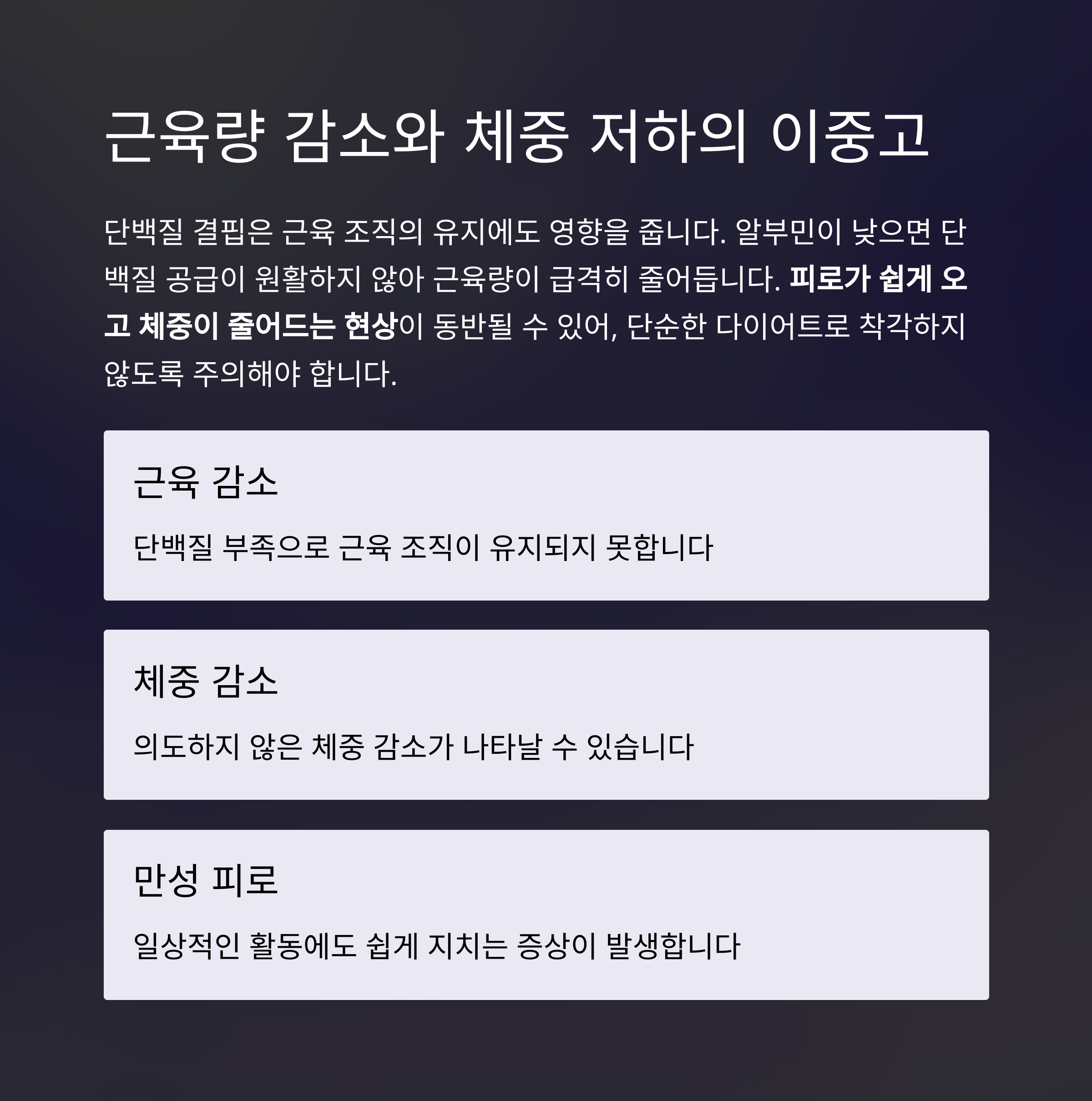 알부민이 낮으면 단백질 공급이 원활하지 않아 근육량이 급격히 줄어듭니다.