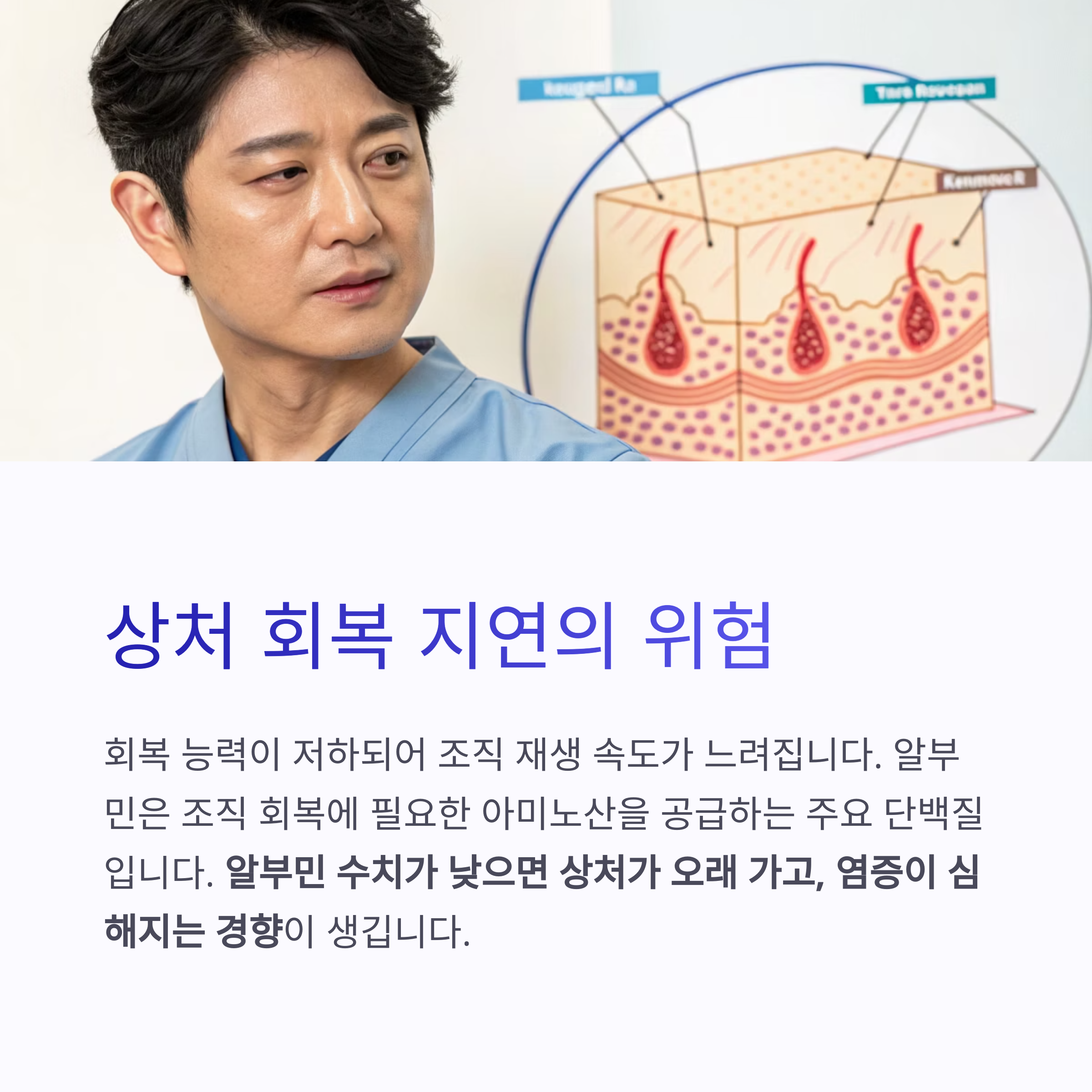 알부민 수치가 낮으면 상처가 오래 가고, 염증이 심해지는 경향이 생깁니다.