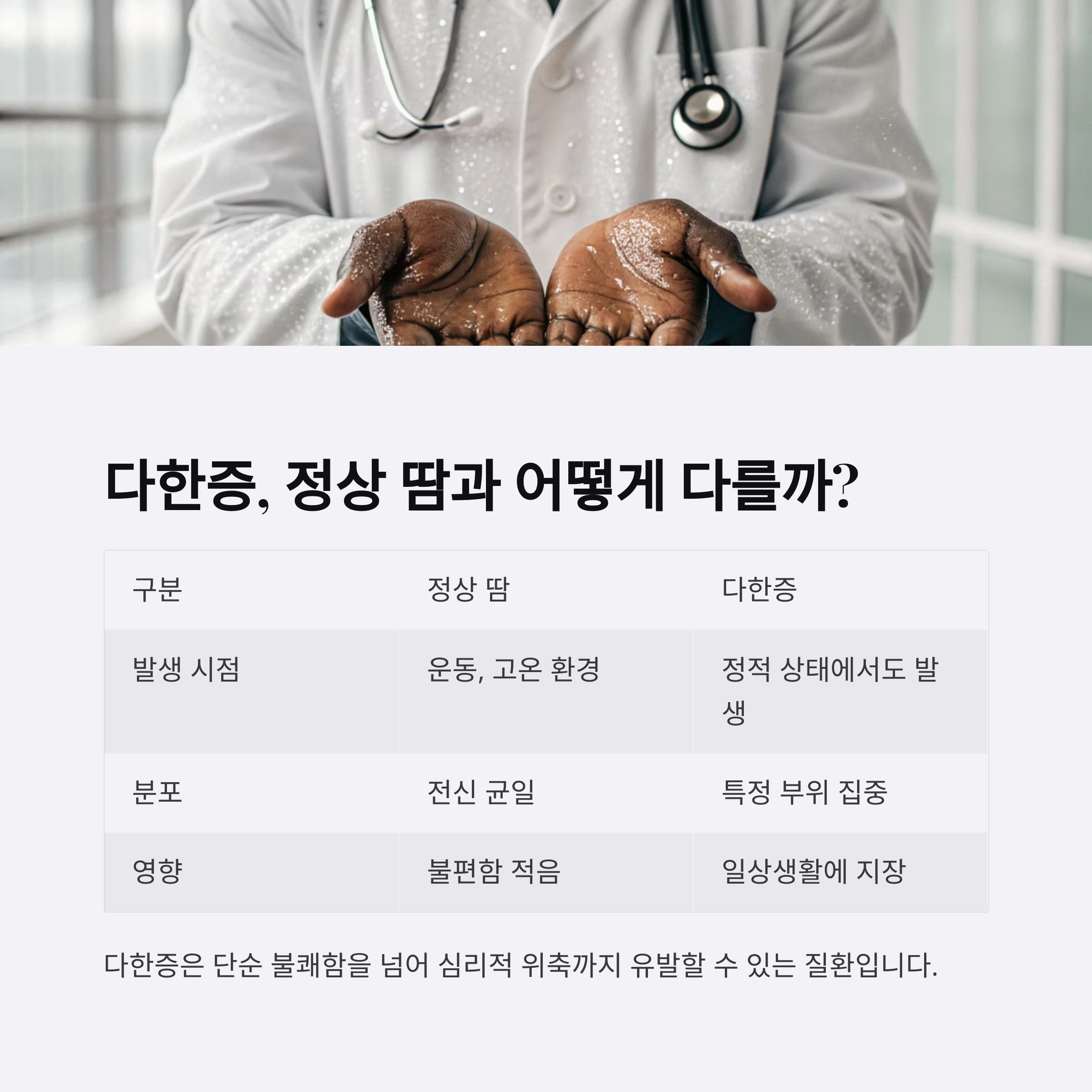 정상적인 땀은 체온을 조절하는 기능이지만, 다한증은 체온 조절 목적 없이 발생합니다.