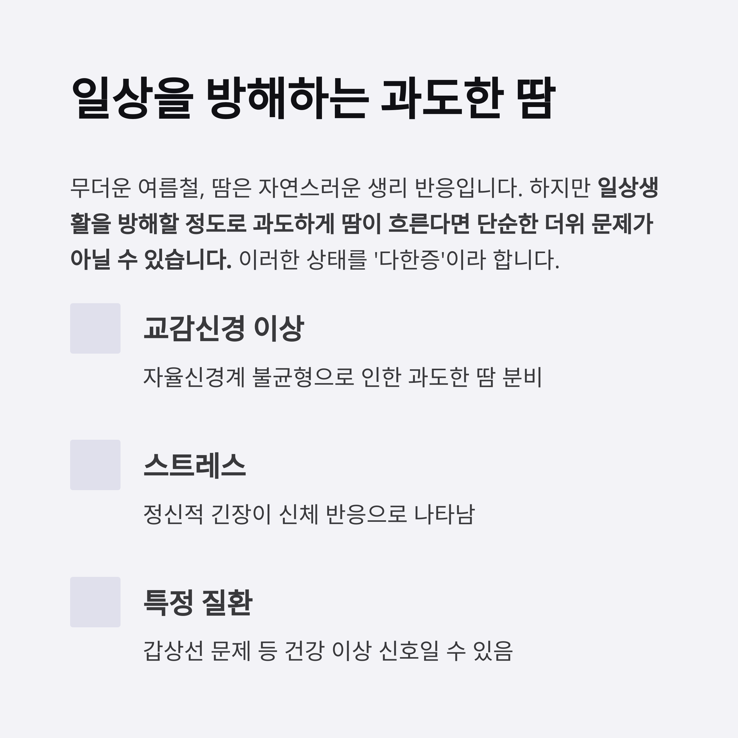 #다한증원인 #여름땀관리 #땀이많은이유 #다한증치료법 #교감신경과민 #여름생활꿀팁