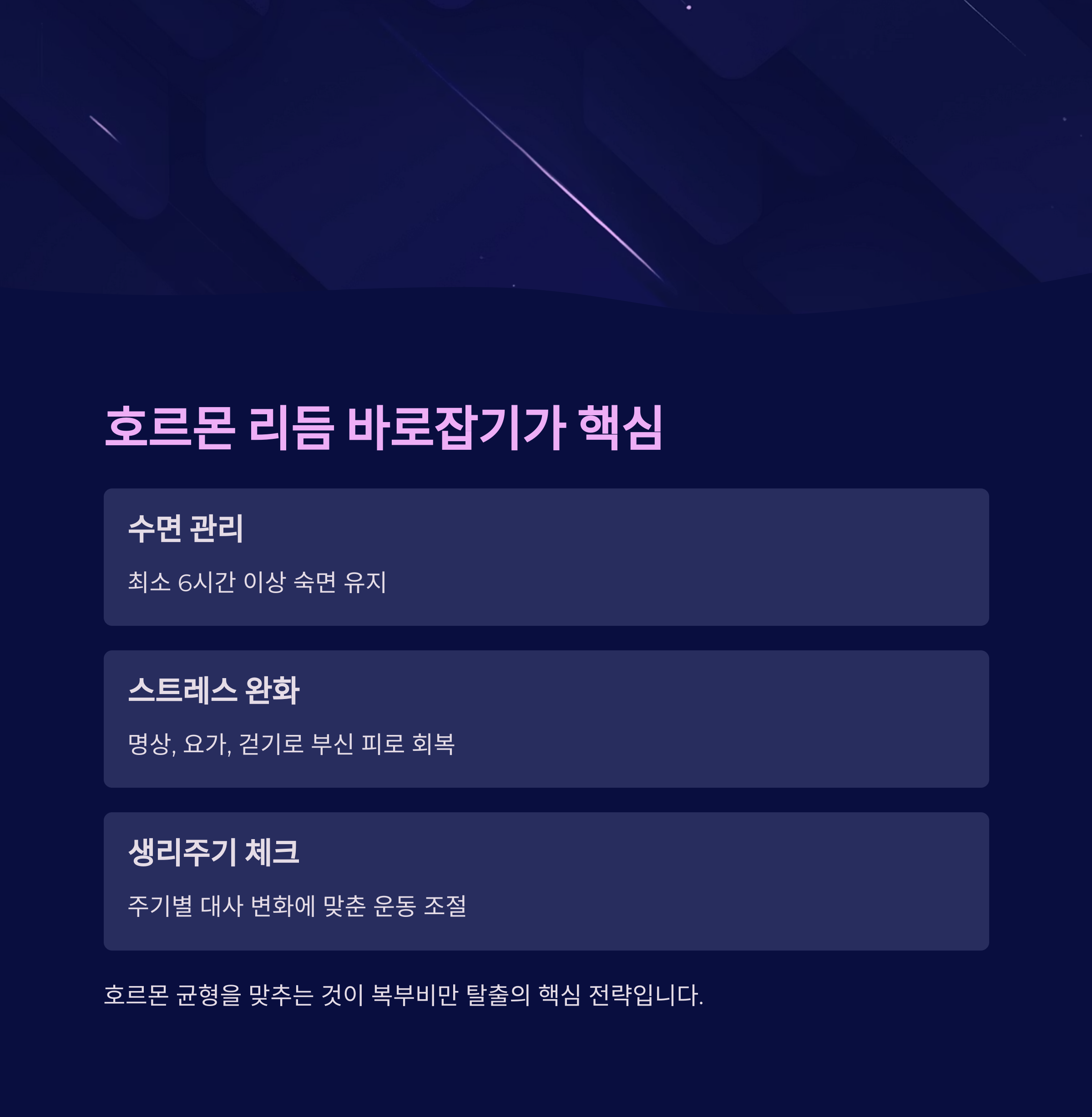 호르몬 밸런스를 회복시키기 위해선 수면, 스트레스 관리, 규칙적인 생체 리듬이 매우 중요합니다.