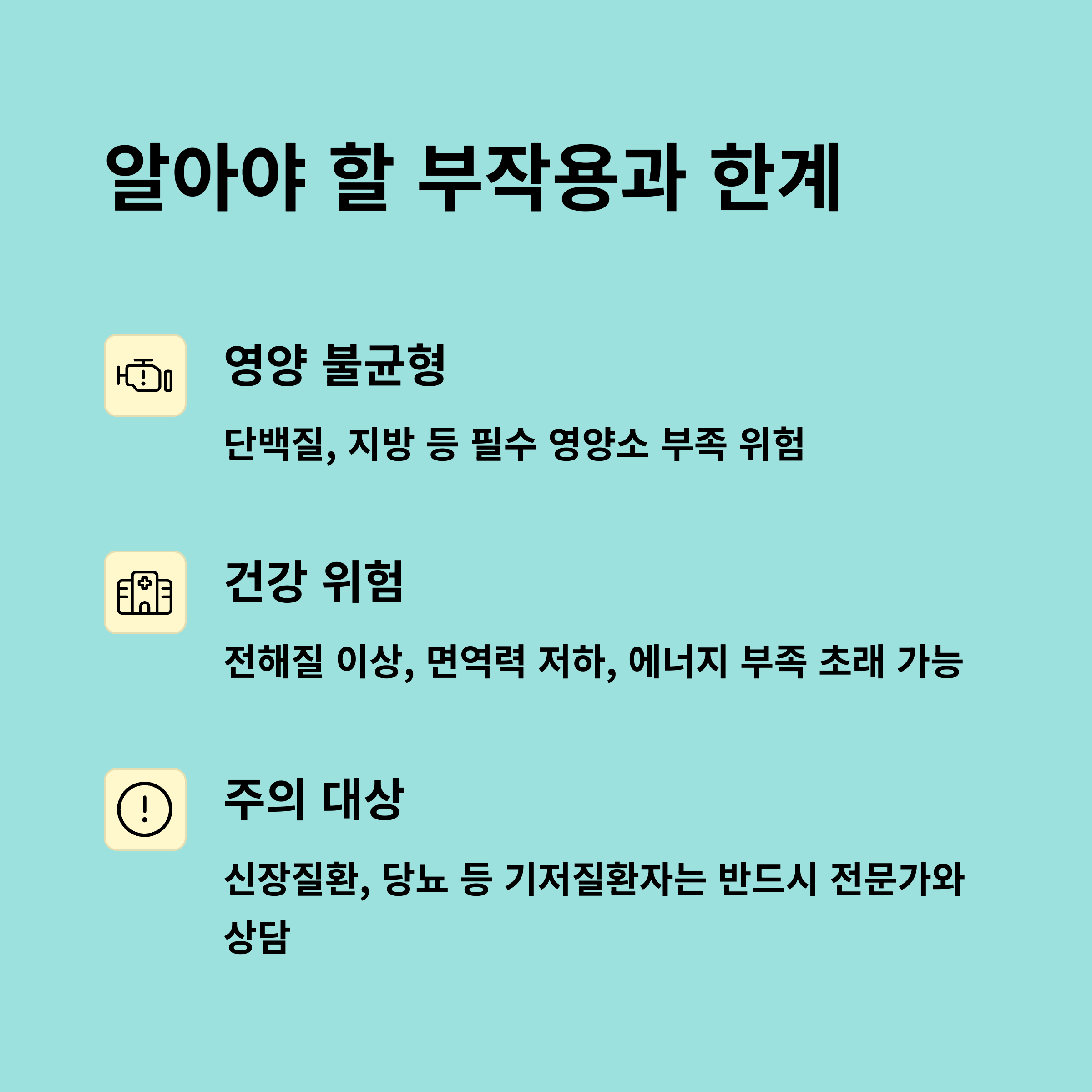 또한, 장기적인 단식 대용으로 사용하면 오히려 건강에 해로울 수 있습니다.