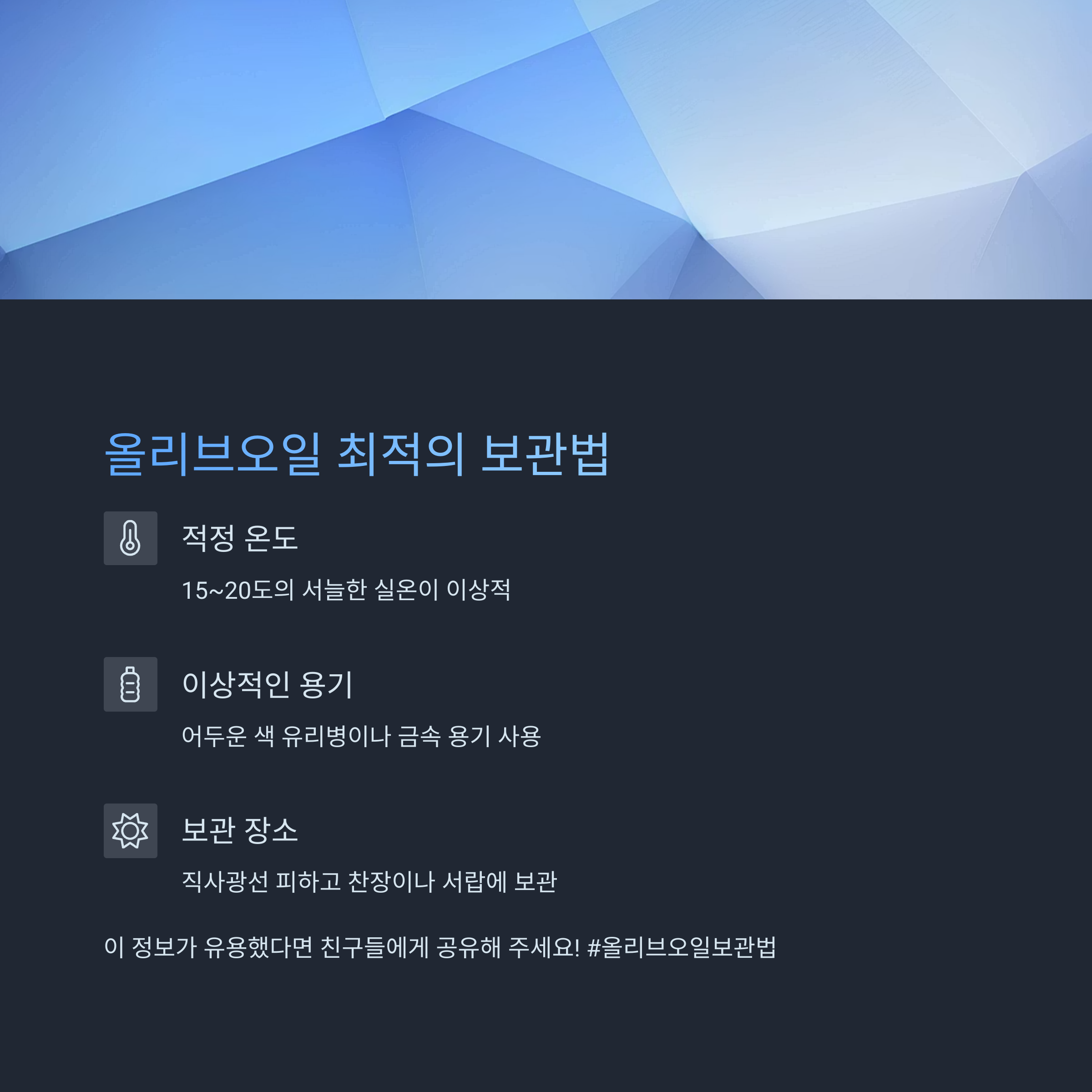 이제 올리브오일, 정확한 보관으로 더욱 건강하게 활용하세요.