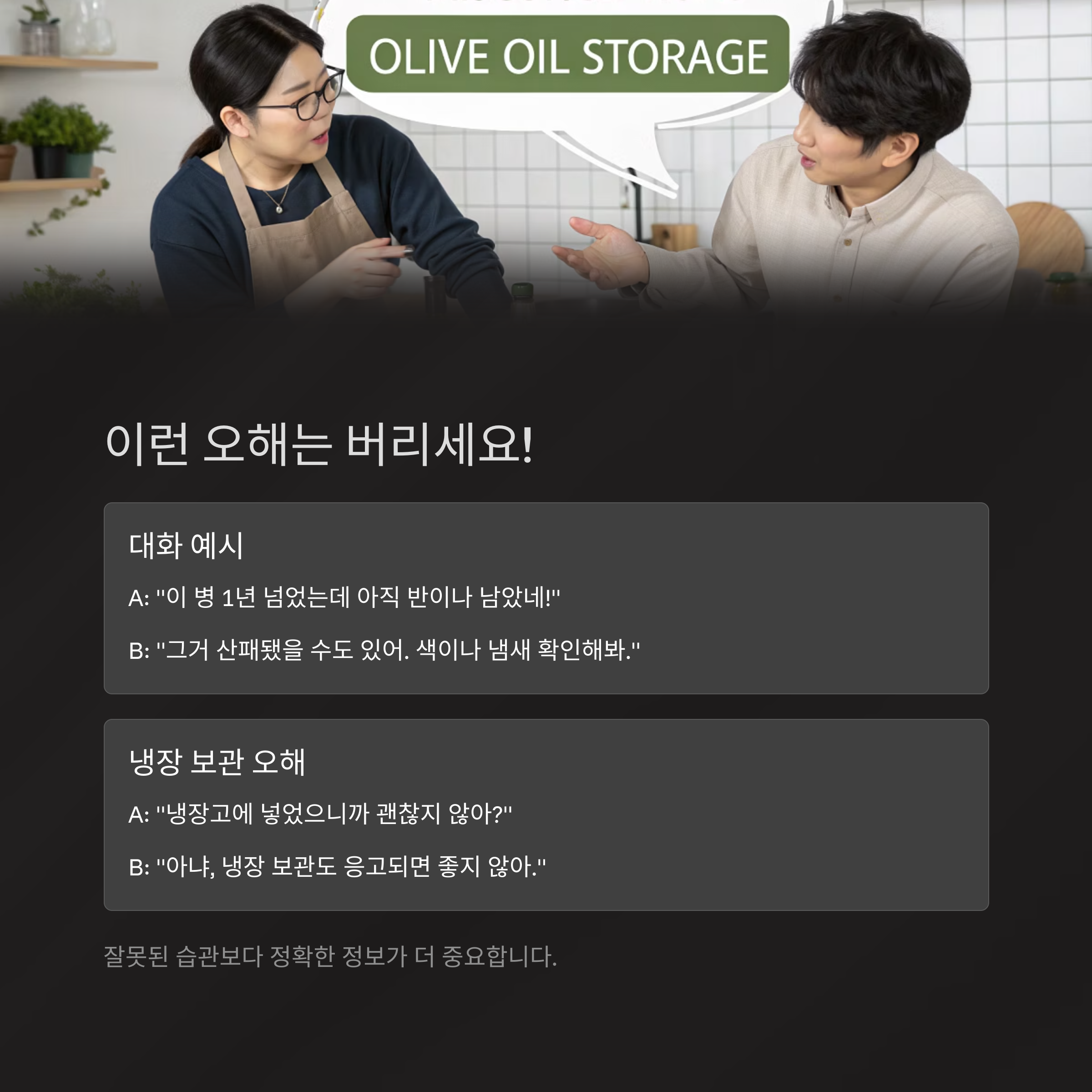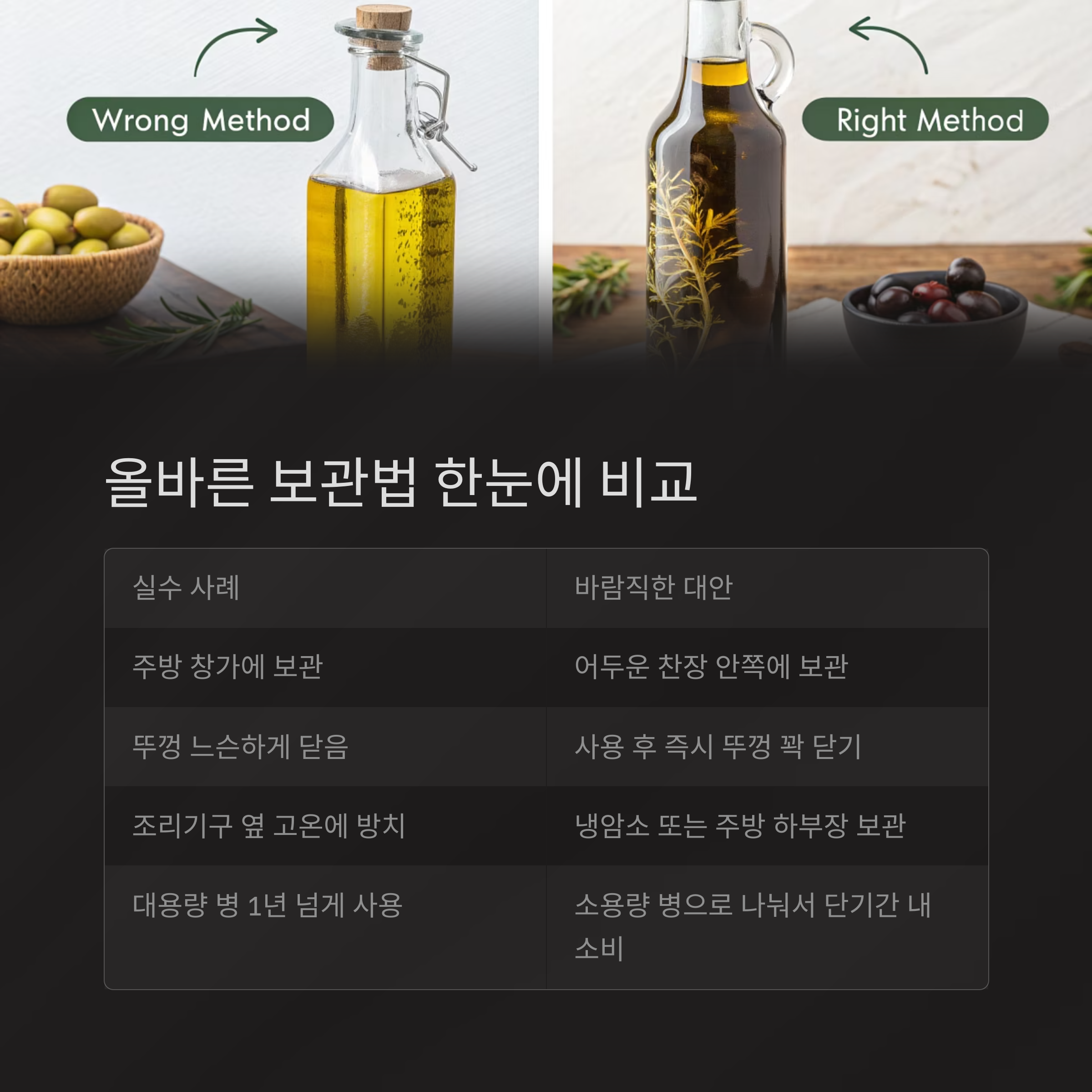 올리브오일 보관 실수 vs 올바른 방법 비교표
