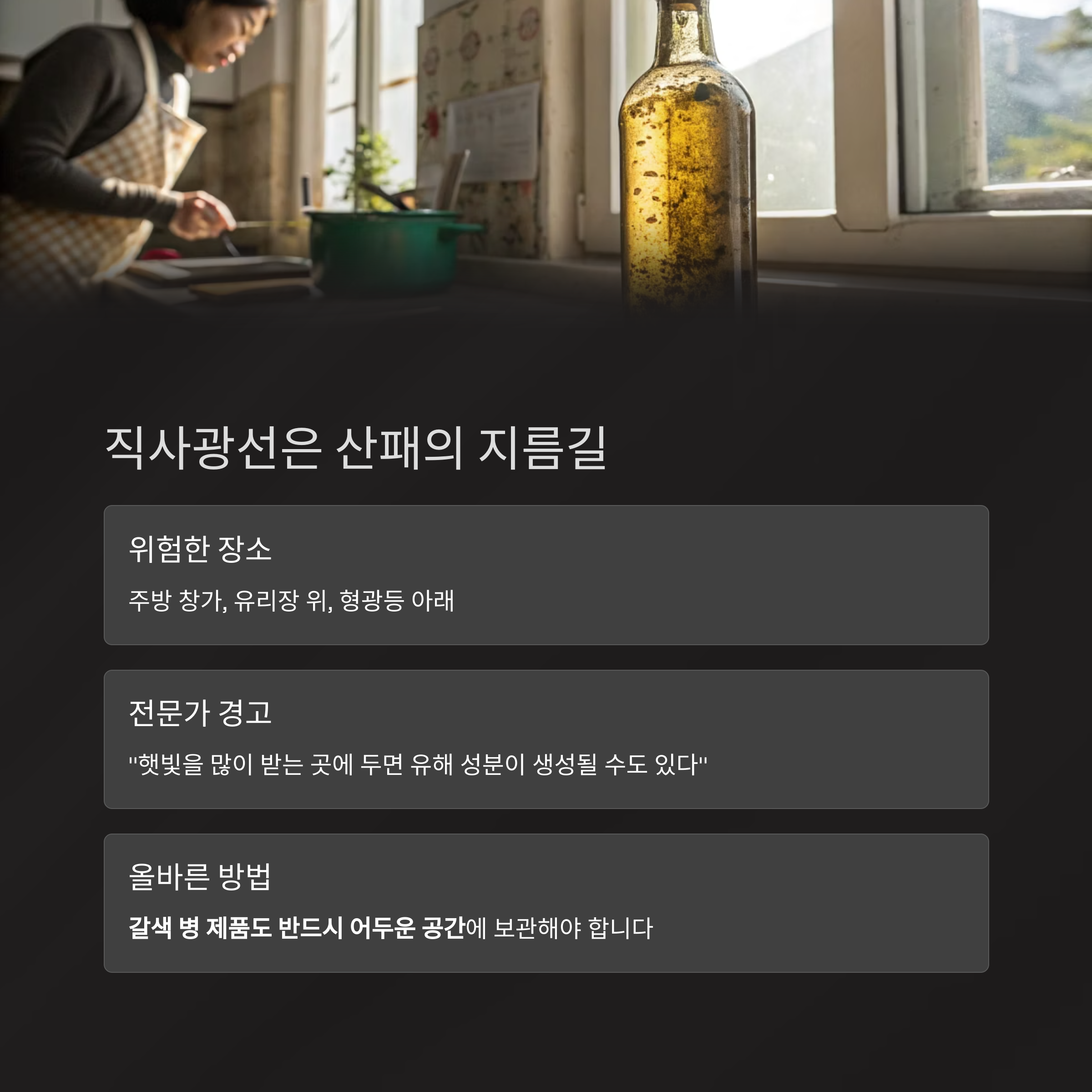 건강을 위해 선택한 올리브오일이 잘못된 보관 습관 때문에 오히려 독이 될 수 있다는 사실, 알고 계셨나요?