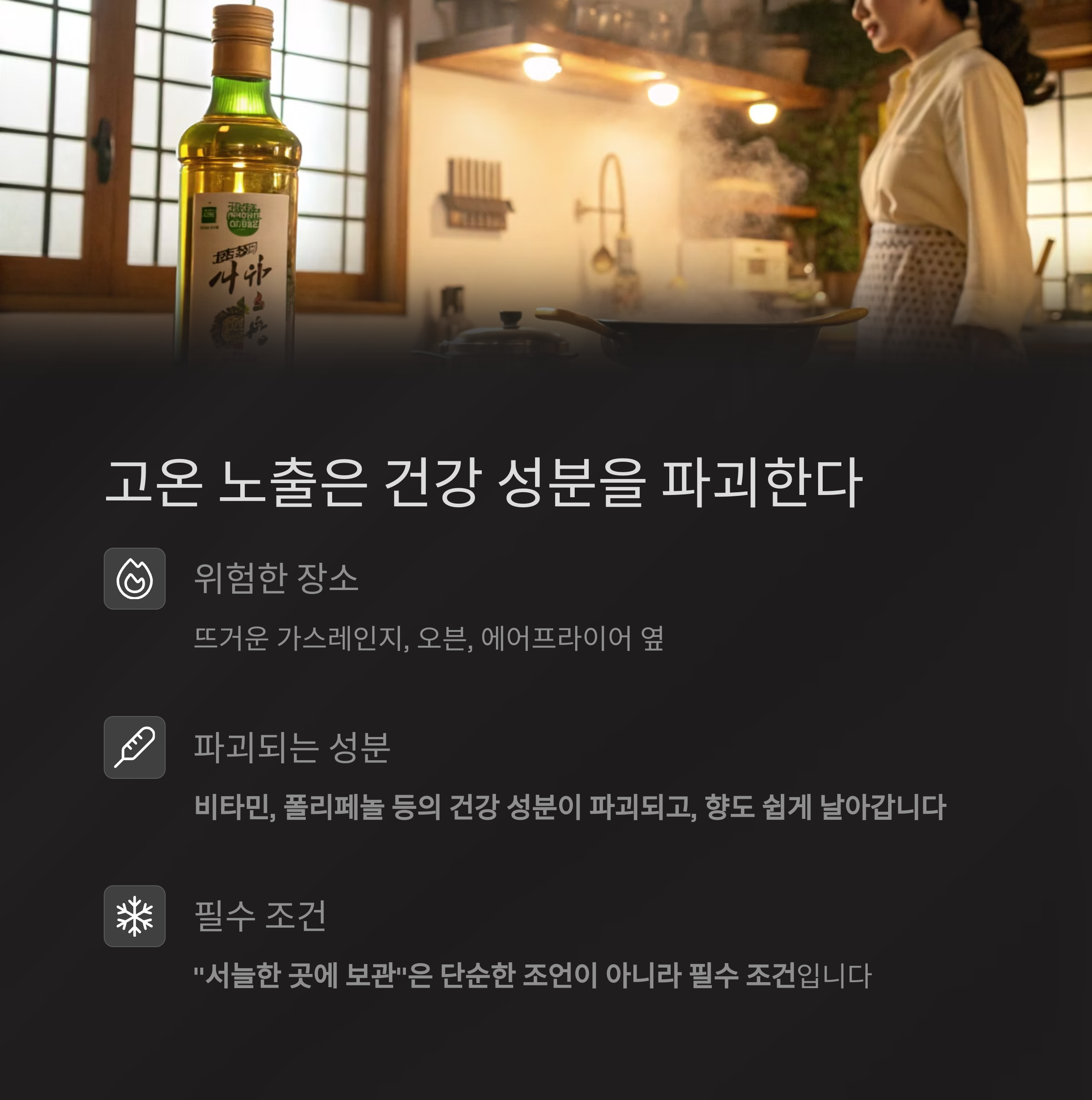 | 조리기구 옆 고온에 방치 | 냉암소 또는 주방 하부장 보관 |