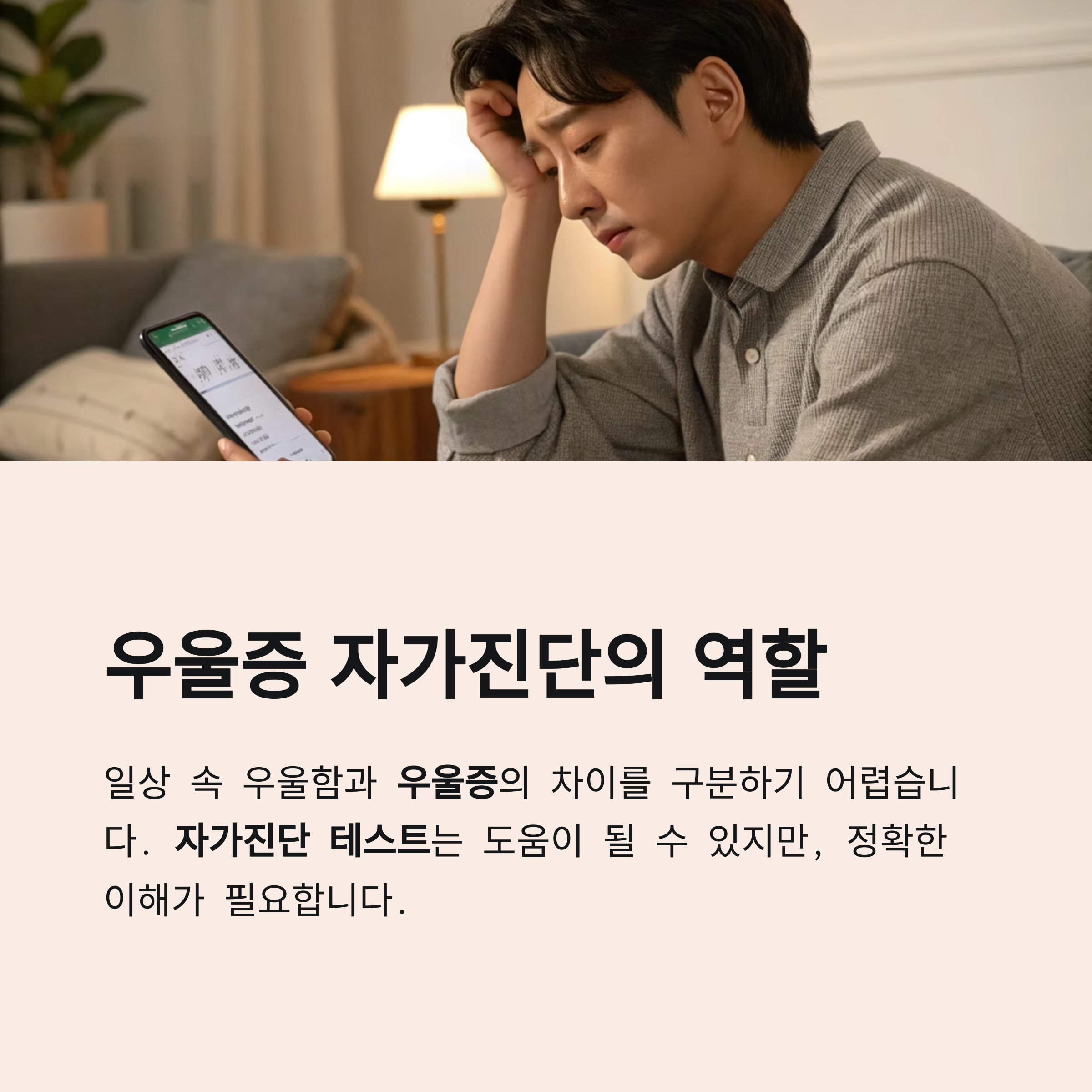 우울증 자가진단은 본격적인 진단이 아니라 우울 증상의 위험 신호를 감지하는 선별 도구입니다.