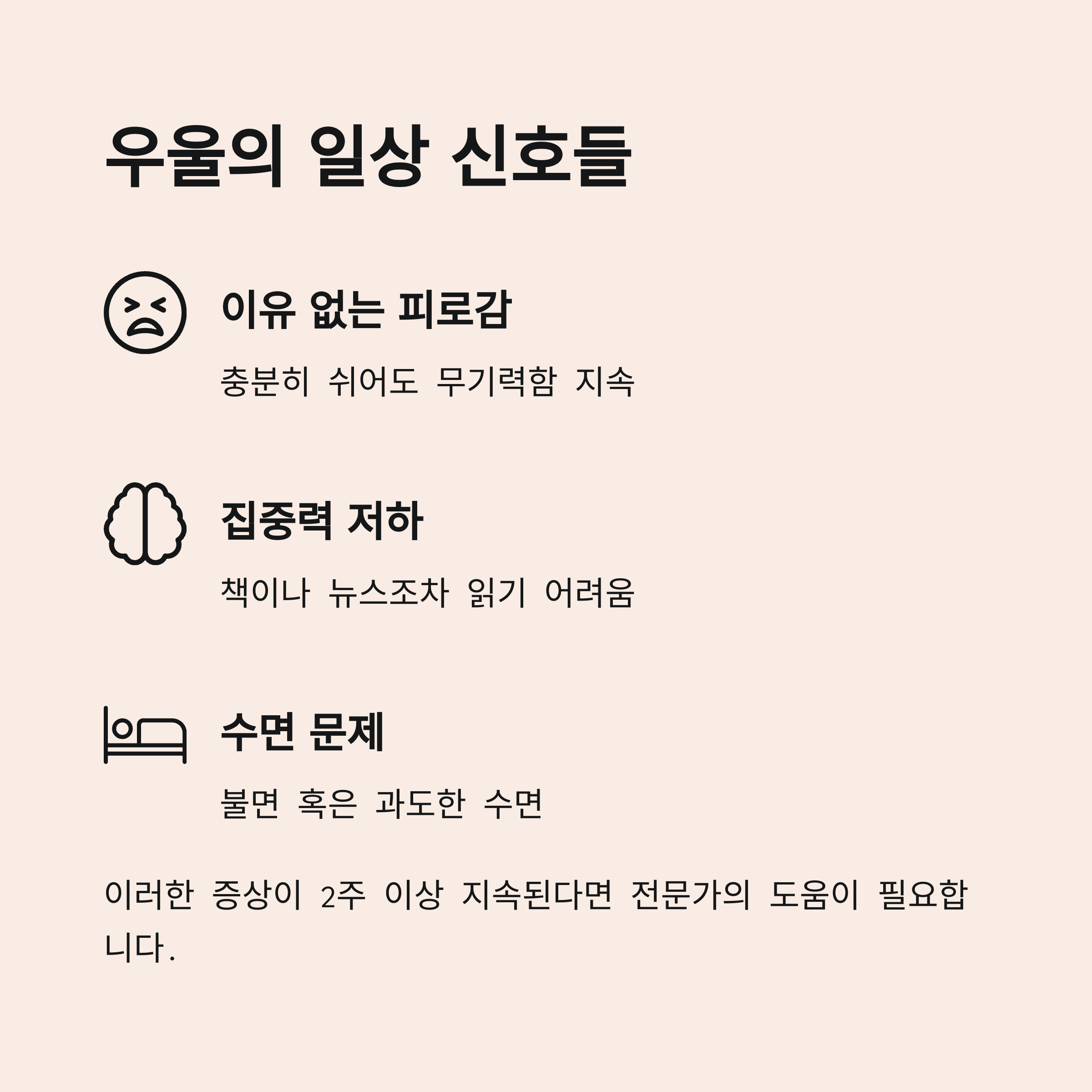 | 이유 없는 피로감 | 충분히 쉬어도 무기력함 지속 |