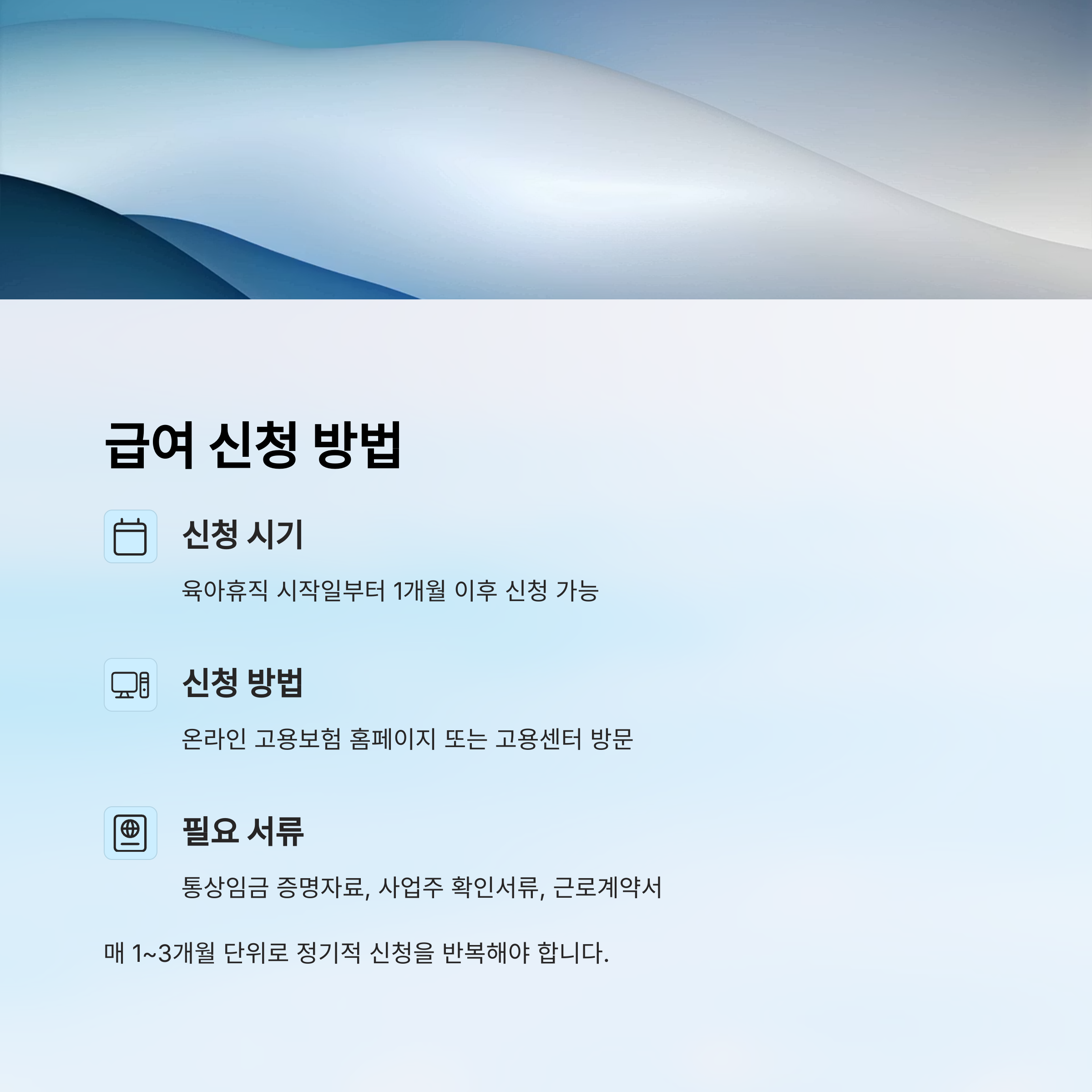급여를 받기 위해서는 육아휴직 시작일부터 1개월 이후에 고용센터를 통해 신청해야 하며, 온라인 고용보험 홈페이지 또는 방문 신청이 가능합니다.