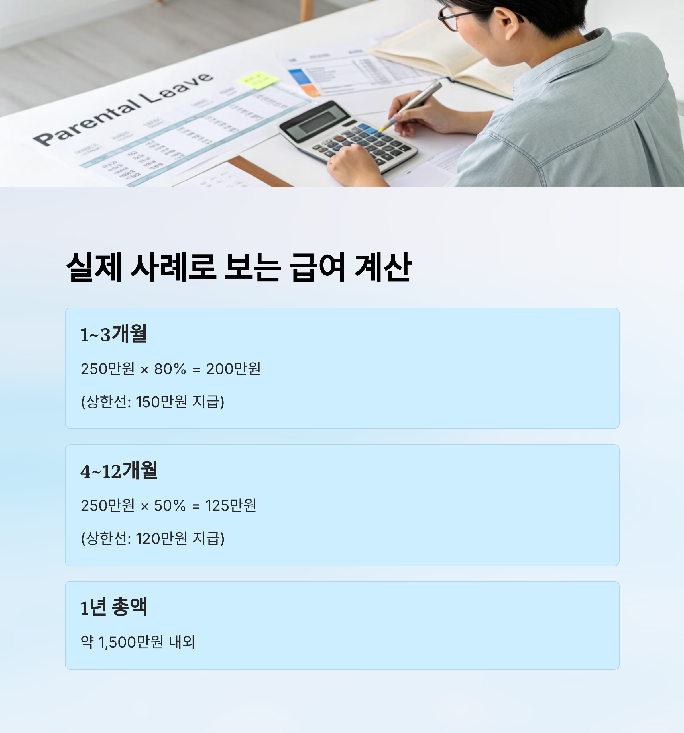실제 사례를 바탕으로 통상임금 250만 원인 직장인의 육아휴직 급여를 계산해보면 다음과 같습니다.