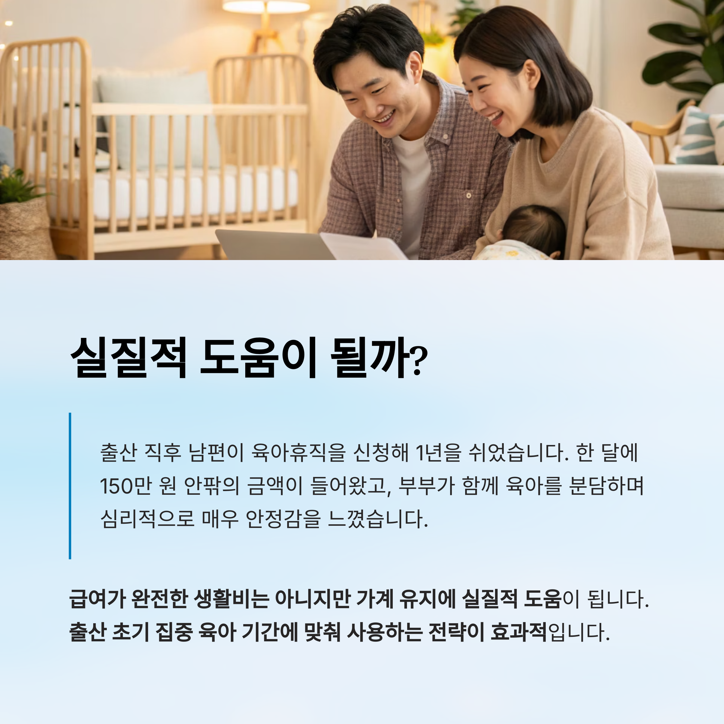 "출산 직후 남편이 육아휴직을 신청해 1년을 쉬었습니다. 한 달에 150만 원 안팎의 금액이 들어왔고, 부부가 함께 육아를 분담하며 심리적으로 매우 안정감을 느꼈습니다."