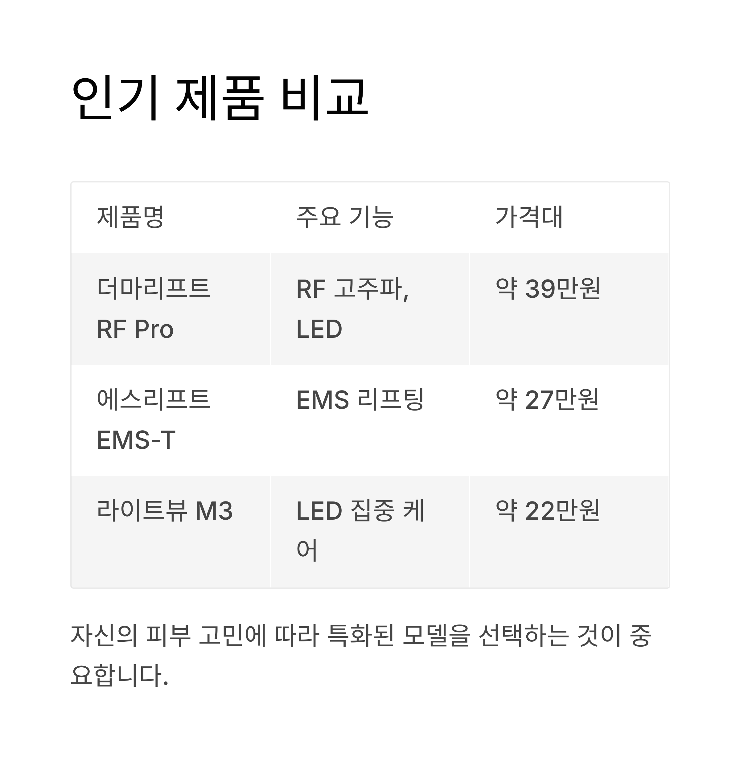 아래는 현재 홈쇼핑과 온라인몰에서 인기 있는 상위 모델 3종 비교입니다.