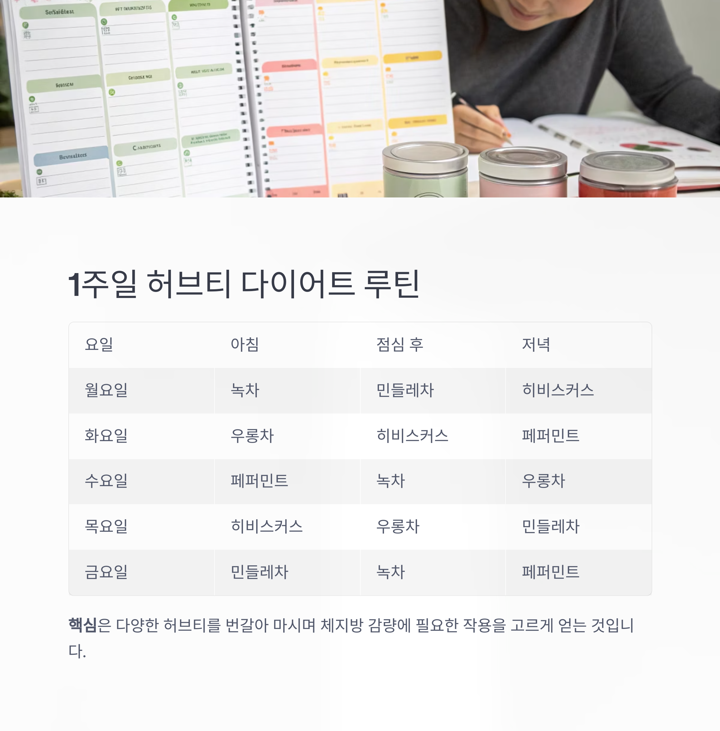아래는 1주일간 다양한 허브티를 활용한 실천 루틴 예시입니다.
