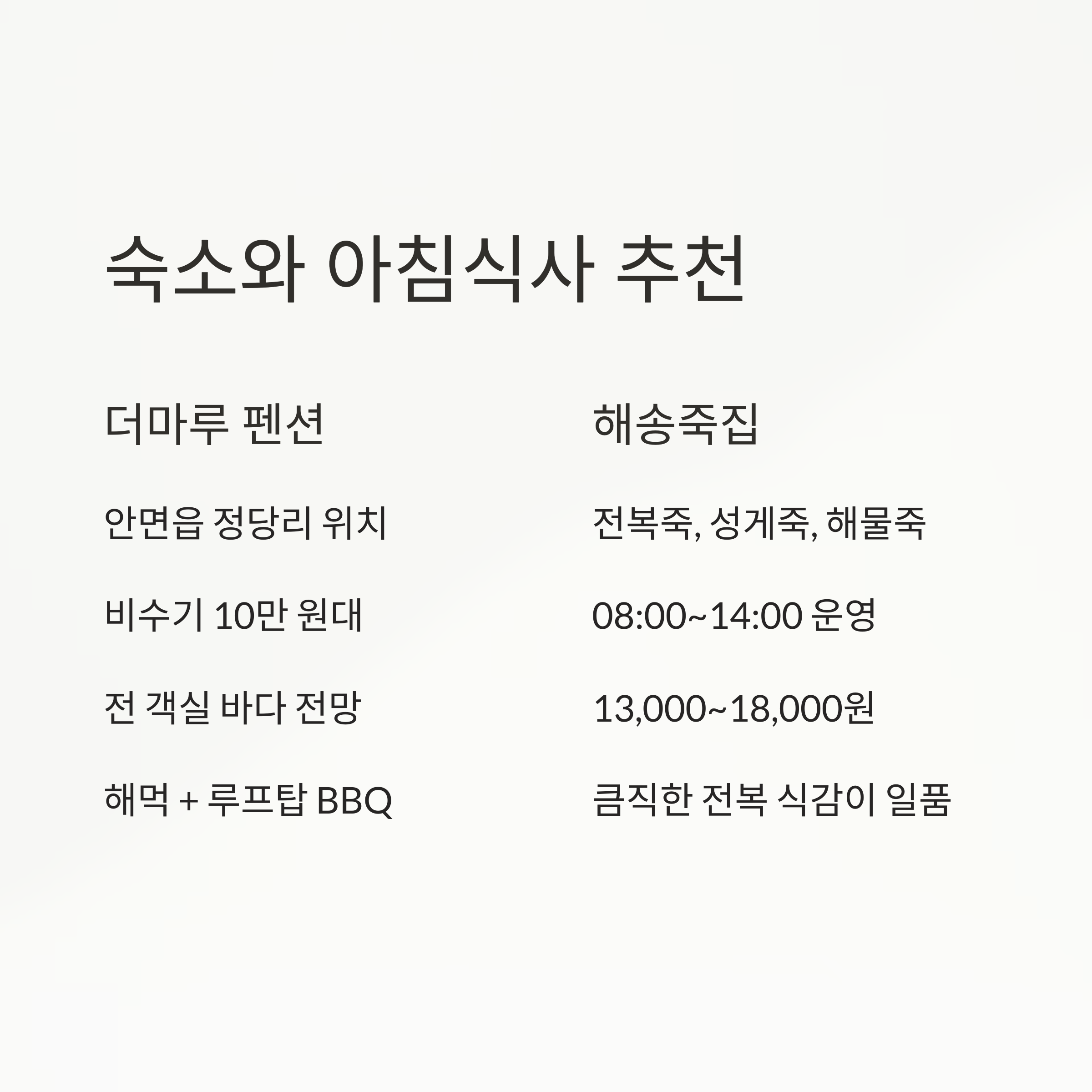 • 메뉴: 전복죽, 성게죽, 해물죽