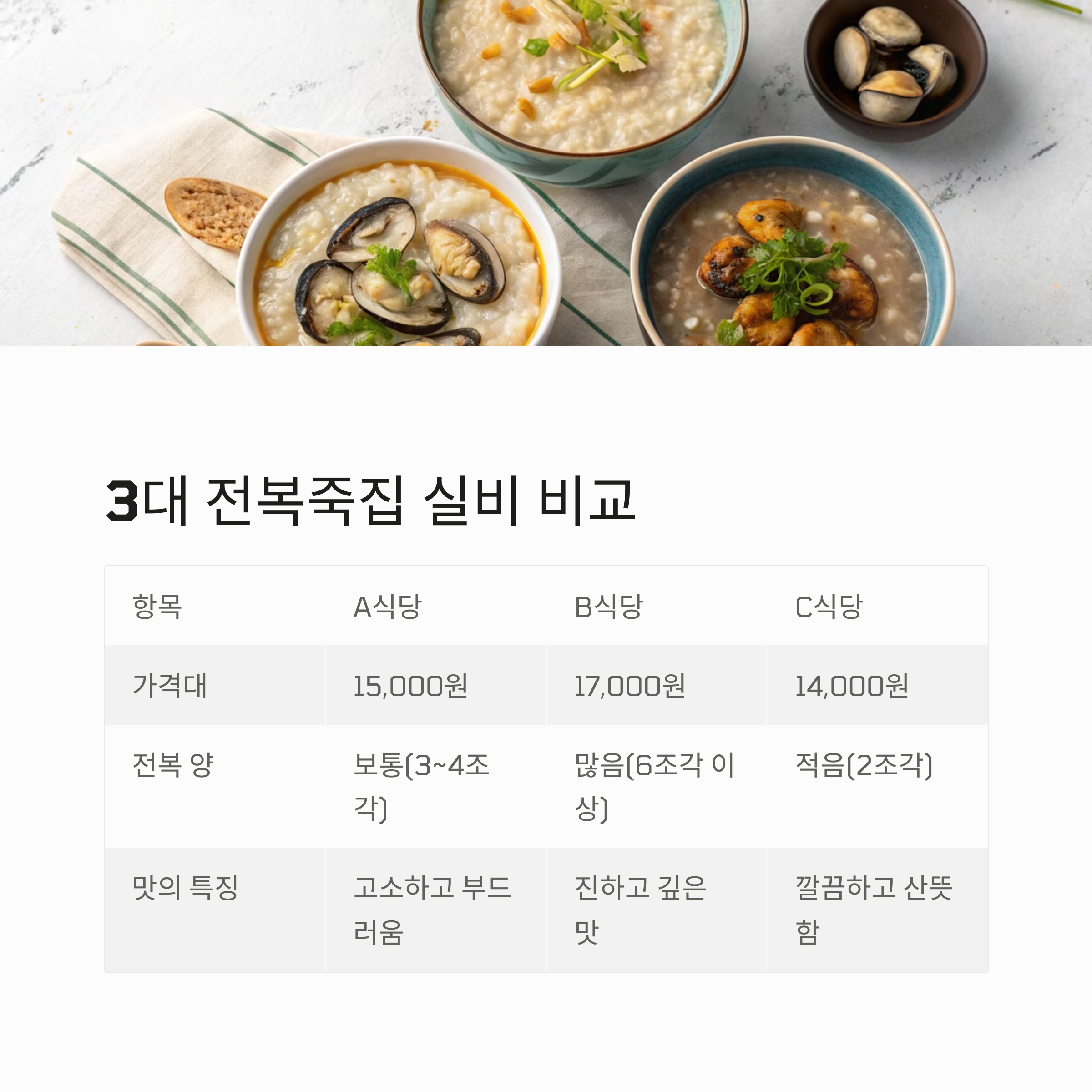 [2] 3대 전복죽집 실비 비교표 – 가격, 양, 맛 차이 한눈에!