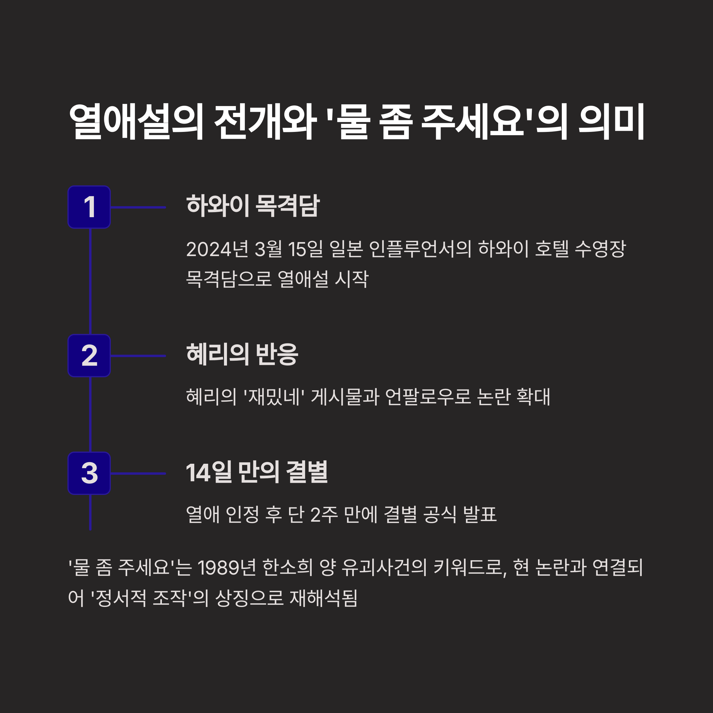 배우 한소희와 류준열의 열애설은 2024년 3월 하와이 목격담을 시작으로 한국 연예계 최대 화제로 부상했습니다. 이 과정에서 전 여자친구 혜리의 소셜미디어 반응이 논란을 확대시켰으며, '환승연애' 의혹과 더불어 '물 좀 주세요'라는 키워드가 역사적 사건과의 유사성으로 재조명받고 있습니다. 본 보고서는 최근 사건의 전말과 역사적 컨텍스트를 종합적으로 분석합니다.