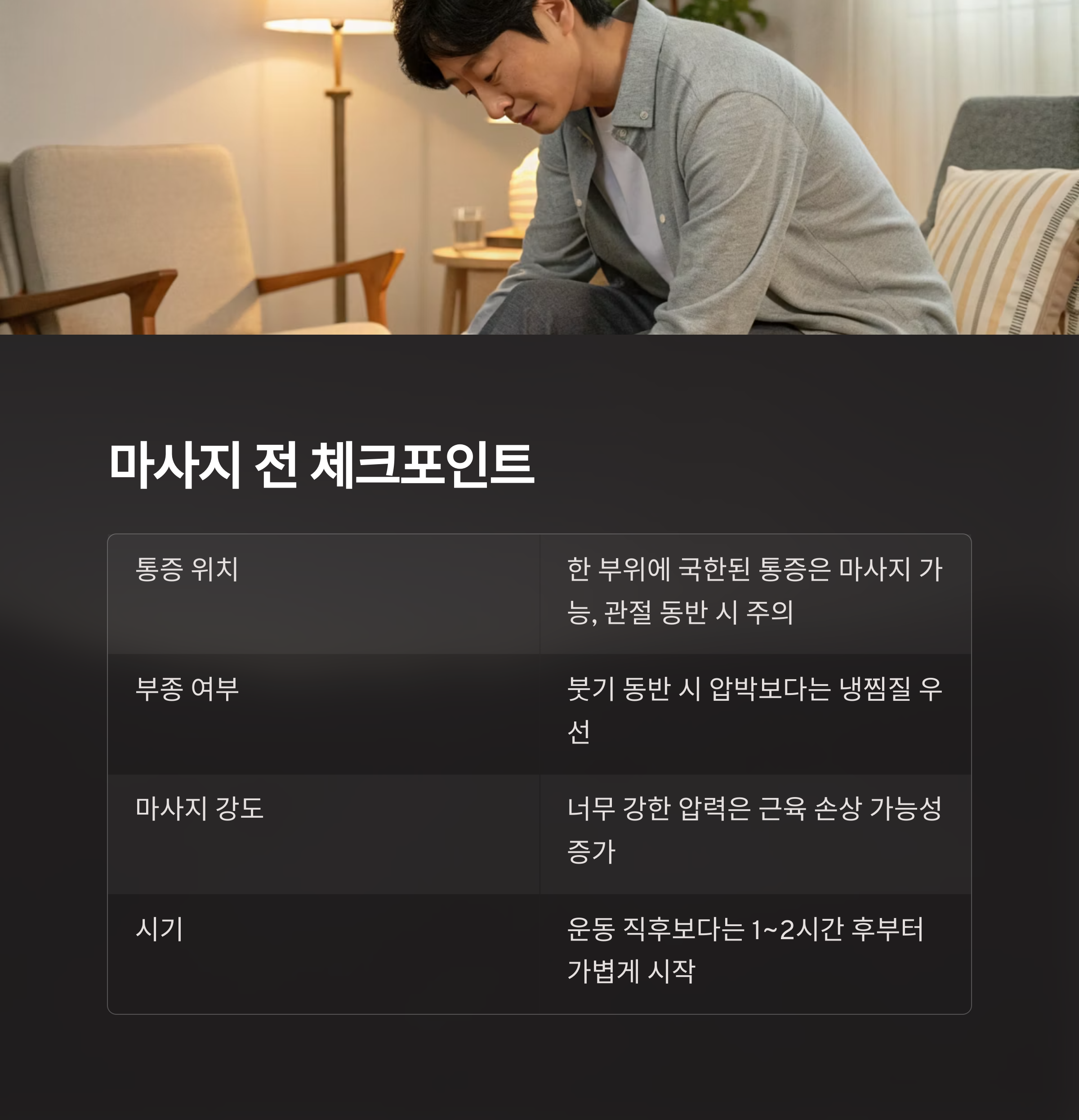 | 마사지 강도 | 너무 강한 압력은 근육 손상 가능성 증가 |